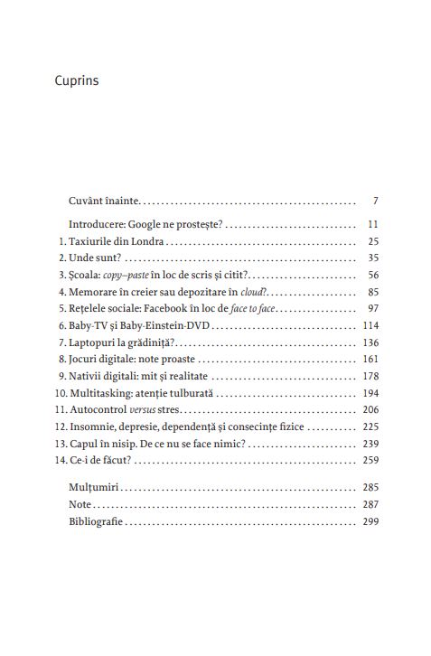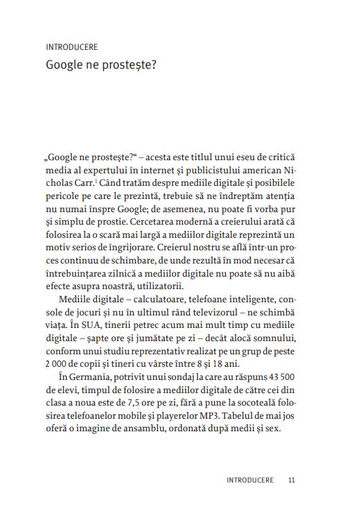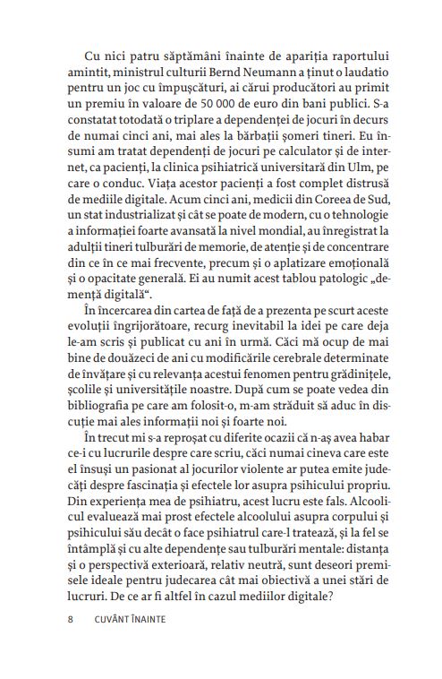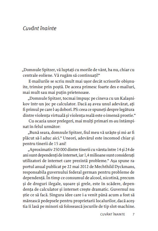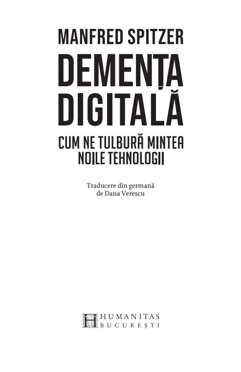 Viața noastră depinde astăzi atât de mult de noile tehnologii, încât am ajuns să ne simțim pierduți fără calculator, internet și telefon inteligent. În fiecare zi o nouă invenție vine să ne facă munca mai ușoară, preluând mai ales din efortul mental pe care ar trebui să-l depunem. Care sunt însă efectele asupra creierului nostru? Asemenea unui mușchi, acesta se atrofiază cu cât este folosit mai puțin. Ne-am obișnuit să căutăm pe Google răspunsul la orice întrebare, să stocăm toate informațiile pe un dispozitiv digital și să efectuăm până și o socoteală simplă pe calculator. În plus, petrecem tot mai mult timp pe rețelele de socializare și înlocuim contactele personale cu cele virtuale. Folosind cele mai recente și importante studii științifice, psihiatrul și specialistul în neuroștiințe Manfred Spitzer investighează influența negativă pe care o pot avea mediile digitale asupra memoriei, puterii de concentrare și abilităților cognitive, în special ale tinerilor, iar cartea este un semnal de alarmă pentru părinți, profesori și politicieni.