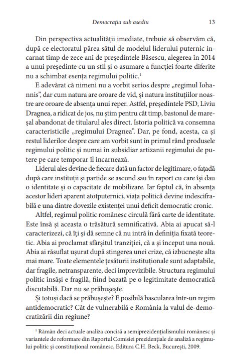 Scopul lucrării de față este să contribuie la înțelegerea etapei în care se află regimul politic din România, dar și din câteva țări vecine: Ungaria, Turcia, Republica Moldova, Federația Rusă. Ce au în comun toate aceste țări? După aproape treizeci de ani de la căderea regimurilor comuniste, asistăm la o așa-numită „de-democratizare”, la un recul al instituțiilor democratice și la utilizarea legitimității democratice în scopul consolidării unor regimuri din ce în ce mai puțin pluraliste, chiar autoritare.