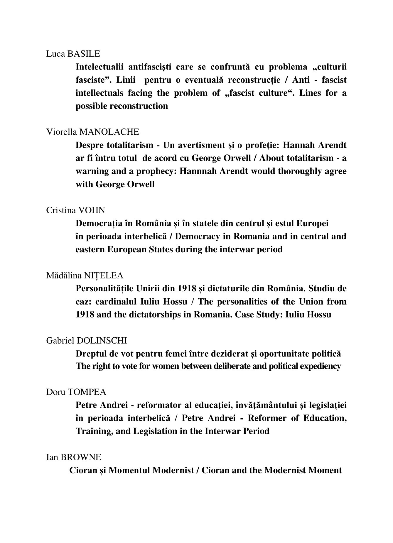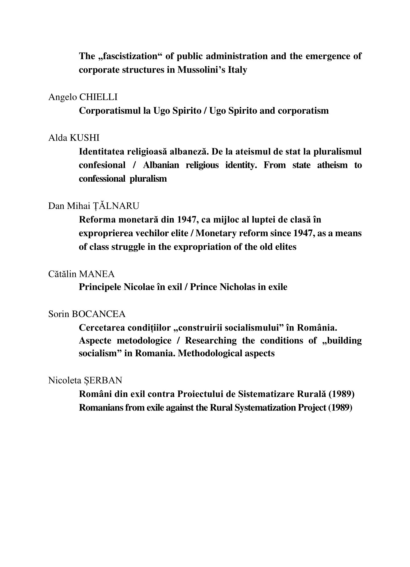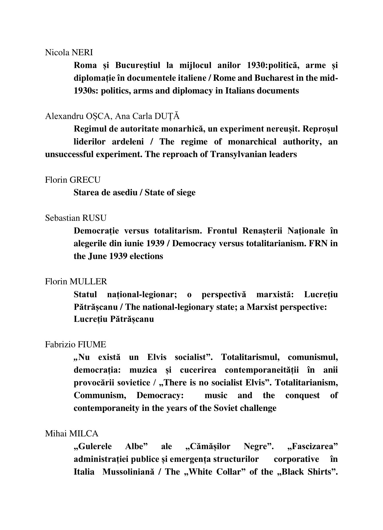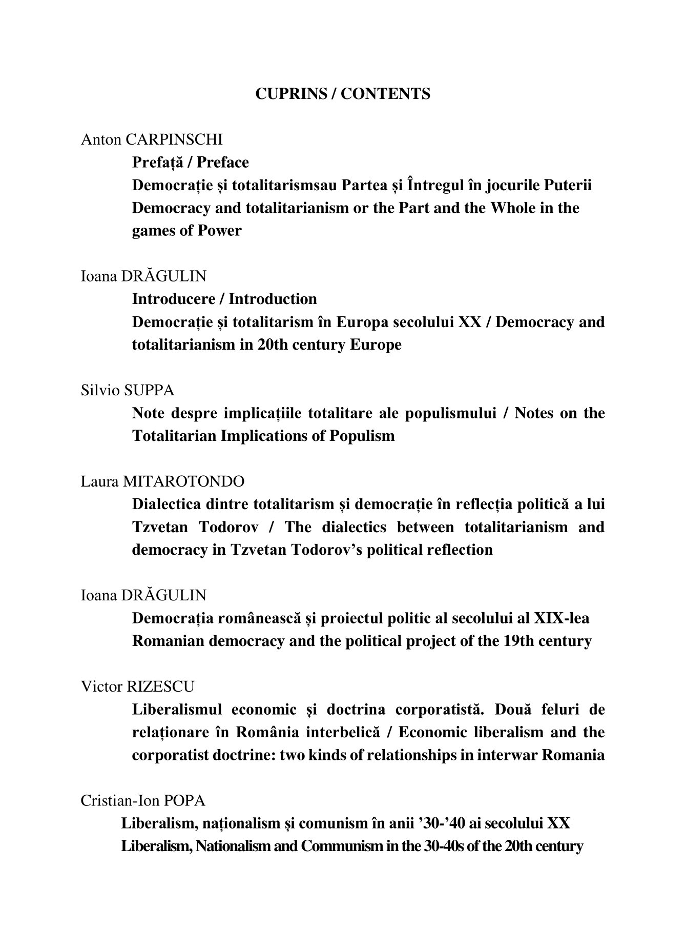 Scurtă descriere: Volumul cuprinde douăzeci și șase de studii ale unor istorici și politologi, dedicate analizei „Democrației și Totalitarismului în Europa Secolului XX“, fiind rezultatul articolelor și studiilor trimise spre publicare de către participanții la Colocviul Național de Istorie, cu participare internațională, ediția a XXIV-a, care s-a desfășurat în 18-19 mai a.c. Din studierea sumarului volumului colectiv se observă că argumentele prezentate de autori sunt diverse. Conceptual vorbind, la nivelul marilor curente istoriografice contemporane se observă o schimbare a paradigmei analizei. Din ce în ce mai mult, istoria ca știință părăsește cadrul analizării fenomenului doar cu argumente specifice domeniului și se deschide către abordări multidisciplinare care permit un amplu spațiu al abordărilor, ce vin să îmbogățească aparatul conceptual specific. În acest context a fost organizată secțiunea de istorie a colocviului, permițând specialiștilor să participe cu studii care privesc o multitudine de argumente. Această viziune demonstrează că și la nivelul reprezentanților școlii istoriografice de la București există o deschidere importantă pentru conectarea cu marile curente de idei care se exprimă la nivel mondial. De aceea, nu ne este teamă să afirmăm că prin temele abordate de autori, am răspuns acestui demers de a deschide o fereastră către multidisciplinaritate, continuând fenomenul de „sincronizare“ cu Occidentul, așa cum Eugen Lovinescu l-a teoretizat la timpul său, prin „teoria sincronismului“.