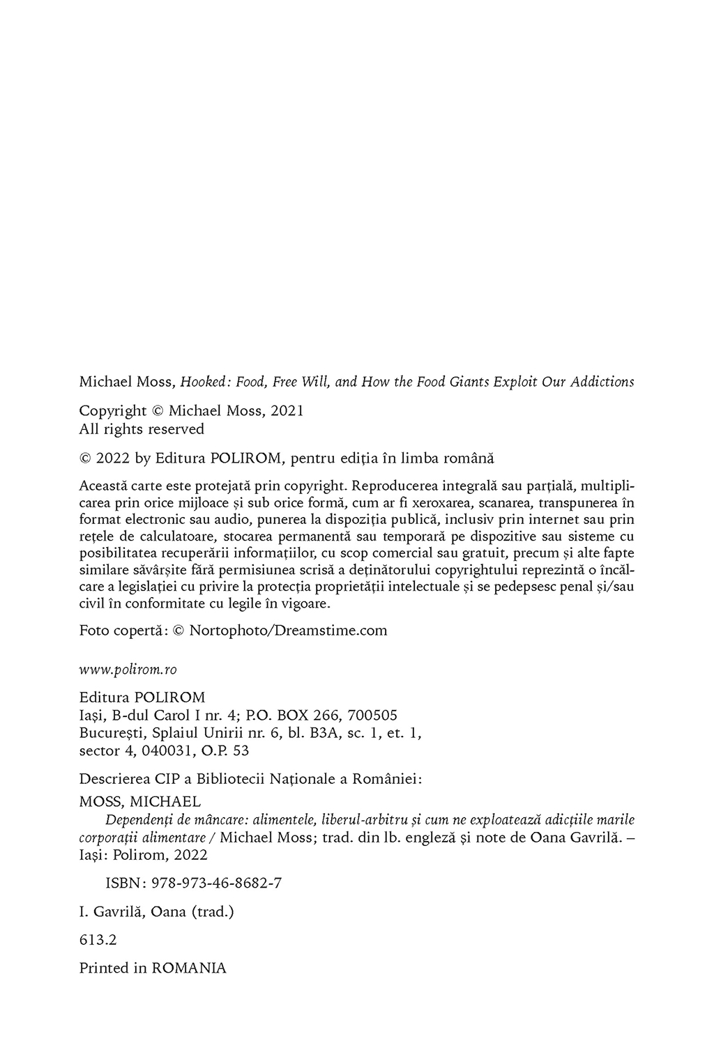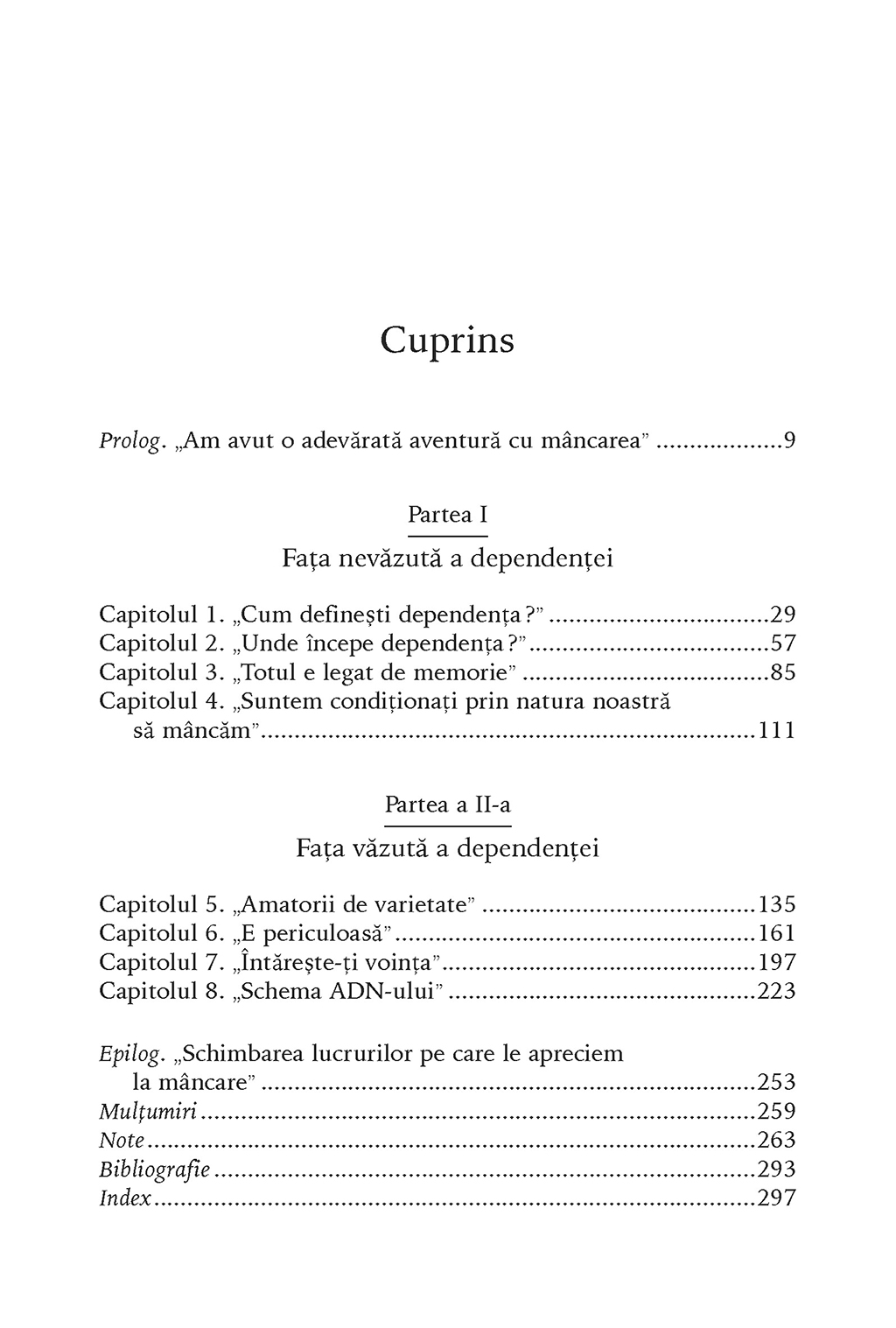 Reporterul american de investigații și laureat al Premiului Pulitzer Michael Moss ne dezvăluie în lucrarea de față ceea ce oamenii de știință și lumea medicală știu deja de mai multe decenii, și anume că unele alimente au o capacitate de a crea dependență mai mare decât cea a țigărilor, a drogurilor sau a alcoolului. Cunoscând aceste lucruri, marile companii producătoare de alimente și laboratoarele de chimie alimentară au creat numeroși aditivi și apelează la tot felul de subterfugii comerciale cu scopul de a ne face tot mai dependenți de produsele lor. În paralel cu aceste eforturi susținute, incidența obezității, mai ales în rândul populației tinere, continuă să crească.