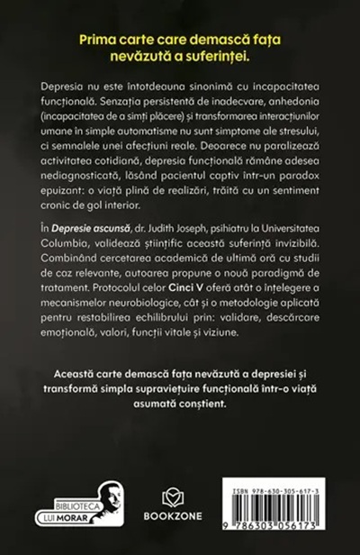 Aceasta este prima lucrare care validează științific suferința oamenilor „prea puternici”. Depresia funcțională nu se manifestă prin tristețe vizibilă, ci prin anhedonie – incapacitatea de a simți bucurie, mascată de un perfecționism epuizant. Bazat pe studii clinice și nu pe sfaturi motivaționale, ghidul Dr. Judith Joseph oferă protocolul celor „5 V”, singura metodă dovedită pentru a reconecta succesul exterior cu liniștea interioară.