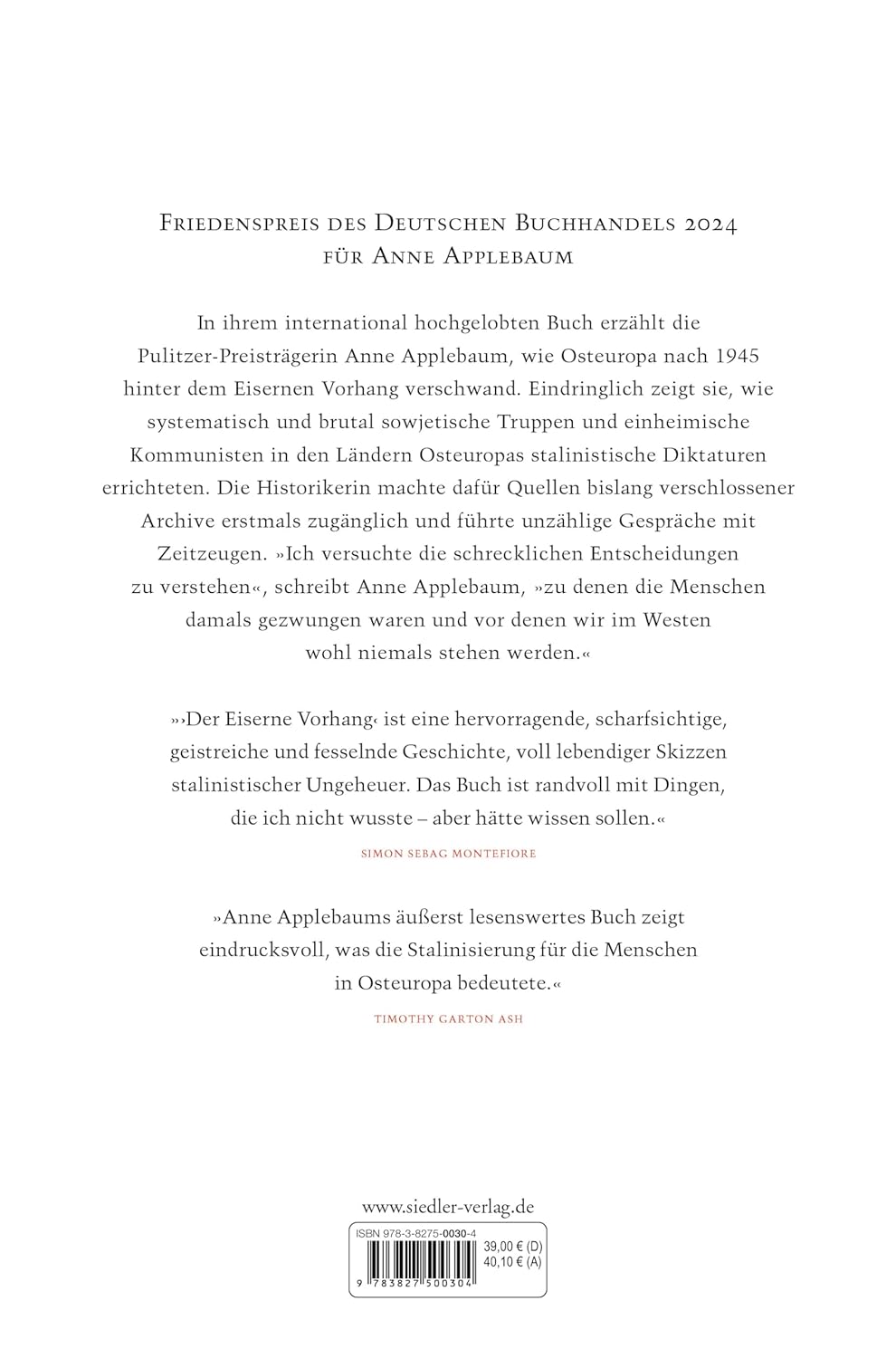In ihrem neuen, hochgelobten Buch erzählt Anne Applebaum, wie Osteuropa nach 1945 hinter dem Eisernen Vorhang verschwand. Auf Basis umfangreicher Archivrecherchen und Gesprächen mit zahlreichen Zeitzeugen zeigt sie eindrucksvoll, wie systematisch und brutal sowjetische Truppen und einheimische Kommunisten in den Ländern Osteuropas stalinistische Diktaturen errichteten und was dies für die Menschen dort bedeutete.