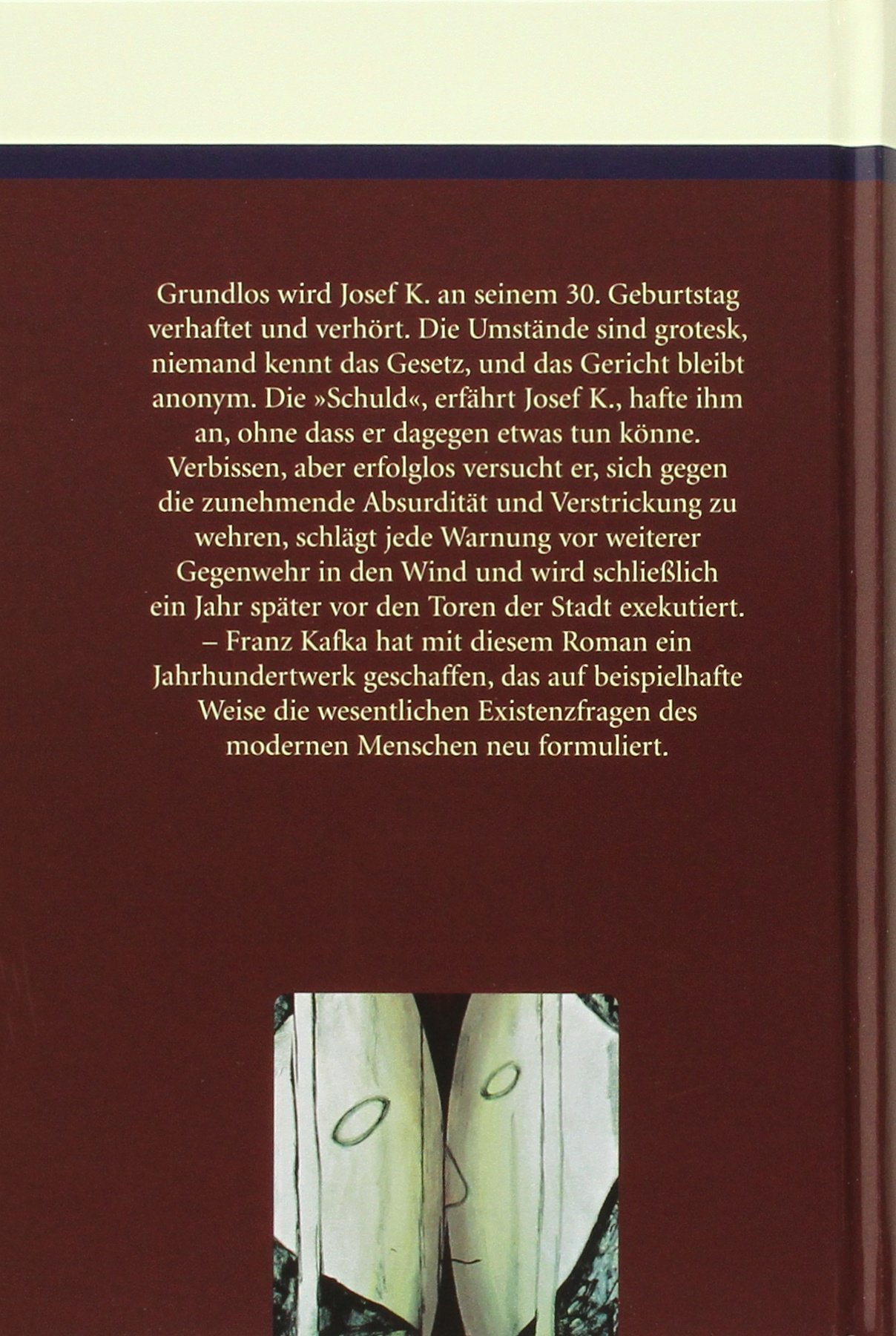 Grundlos wird Josef K. an seinem 30. Geburtstag verhaftet und verhört. Die Umstände sind grotesk, niemand kennt das Gesetz, und das Gericht bleibt anonym. Die 'Schuld', erfährt Josef K., haftet ihm an, ohne dass er dagegen etwas tun könnte. Verbissen, aber erfolglos versucht er, sich gegen die zunehmende Absurdität und Verstrickung zu wehren, schlägt jede Warnung vor weiterer Gegenwehr in den Wind und wird schließlich ein Jahr später vor den Toren der Stadt exekutiert. Franz Kafka hat mit diesem Roman ein Jahrhundertwerk geschaffen, das auf beispielhafte Weise die wesentlichen Existenzfragen des modernen Menschen neu formuliert.