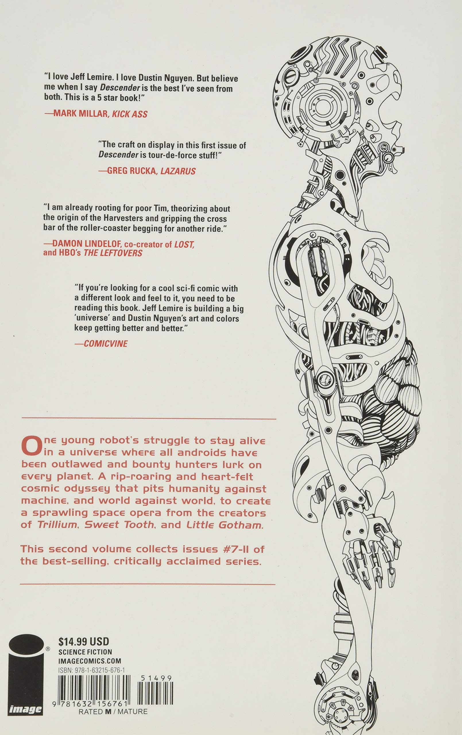 Young Robot boy TIM-21 and his companions struggle to stay alive in a universe where all androids have been outlawed and bounty hunters lurk on every planet. Written by award-winning creator, Jeff Lemire, Descender is a rip-roaring and heart-felt cosmic odyssey. Lemire pits humanity against machine, and world against world, to create a sprawling epic. Collecting issues #1-6 of Jeff Lemire (Sweet Tooth, Trillium) and Dustin Nguyen's (Little Gotham) critically acclaimed, bestselling new science fiction series! "New York Times Bestselling author Jeff Lemire has built a unique career as both the writer and artist of acclaimed literary graphic novels like Essex County, The Underwater Welder, Sweet Tooth and Trillium and also as one of the most popular writers of mainstream superhero comics with acclaimed runs on such titles as Green Arrow, Animal Man, Justice League and Hawkeye for Marvel and DC Comics.