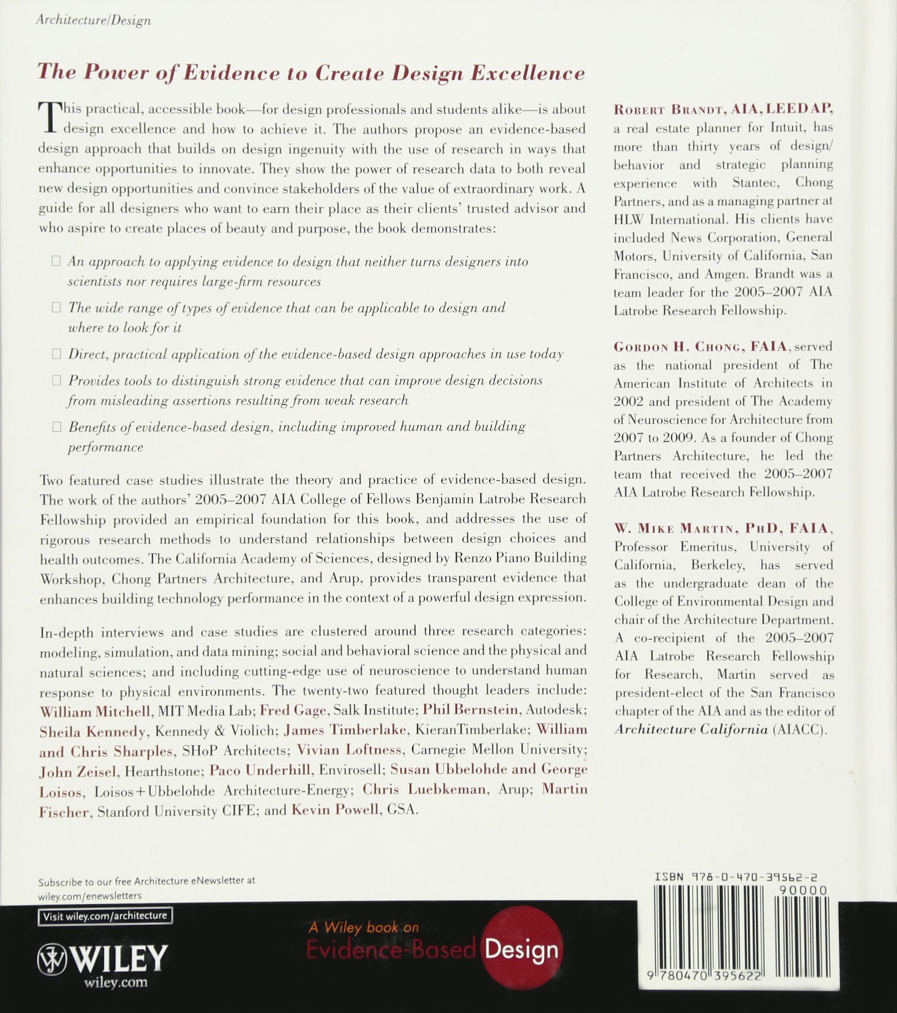 Co-written by a former AIA national president and the chair of architecture at UC-Berkeley, this book is a collection of key case studies of evidence-based design applied to architectural design primarily for healthcare and office buildings. Research in issues such as lighting, acoustics, and color is applied to human performance data and other metrics. Evidence-Based Architectural Design digs deeply into factual specifics and builds upon the research that the authors have completed as winners of the 2005 $100,000 Latrobe Fellowship, awarded by the AIA College of Fellows.