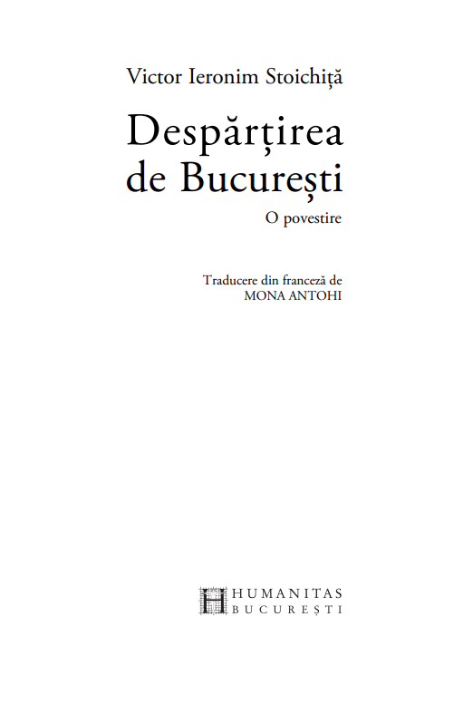 Cu Despărţirea de Bucureşti, cunoscutul istoric de artă Victor Ieronim Stoichiţă îşi face debutul strălucit în proza literară, evocând, într-o „povestire“ scrisă la persoana întâi, viaţa din România deceniilor şase şi şapte ale secolului trecut, lumea în care generaţia naratorului anonim şi-a petrecut copilăria şi tinereţea.