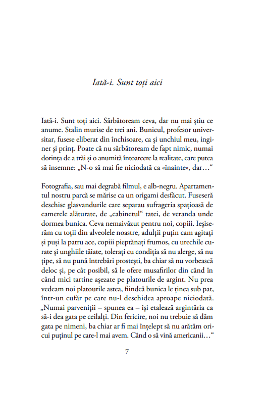 Este o lume alcătuită din amintirile celor mari şi din descoperirile celor mici, o lume bântuită de spaime şi vorbind în şoaptă, care şi-a pierdut rosturile dinainte şi încearcă să supravieţuiască pustiului „vremurilor noi“ de după război. O galerie de personaje memorabile, puse în situaţii care mai de care mai grăitoare, trimite totuşi cu gândul la subtilul cititor de tablouri care este autorul.
