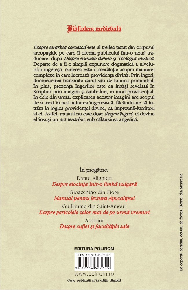 Despre ierarhia cerească este al treilea tratat din corpusul areopagitic pe care îl oferim publicului într-o nouă traducere, după Despre numele divine și Teologia mistică. Departe de a fi o simplă expunere dogmatică a nivelurilor îngerești, scrierea este o meditație asupra manierei complexe în care lucrează providența divină. Prin îngeri, dumnezeirea transmite darul său de lumină primordial. În plus, prezența îngerilor este ea însăși revelată în Scripturi prin imagini și simboluri, în mod providențial. În cele din urmă, explicarea acestor imagini are scopul de a trezi în noi imitarea îngerească, făcându-ne să intrăm în logica providenței divine, ca împreună-lucrători ai ei. Astfel, tratatul nu este doar despre îngeri, ci devine el însuși un act ierarhic, sub călăuzirea angelică.