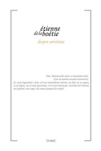 De La Boetie ofera una dintre primele si cele mai clare explicatii privind servitutea voluntara, starea care defineste supunerea majoritatii fata de minoritatea care detine puterea politica. Este si va ramane acelasi lucru, indiferent de scurgerea timpului: un eseu memorabil despre maretia si micimile naturii umane, slujit exemplar de gandul si de pana unui geniu cu care timpul nu a avut prea multa rabdare.