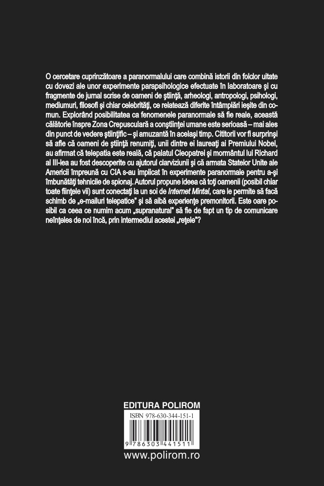 O cercetare cuprinzătoare a paranormalului care combină istorii din folclor uitate cu dovezi ale unor experimente parapsihologice efectuate în laboratoare şi cu fragmente de jurnal scrise de oameni de ştiinţă, arheologi, antropologi, psihologi, mediumuri, filosofi şi chiar celebrităţi, ce relatează diferite întâmplări ieşite din comun. Explorând posibilitatea ca fenomenele paranormale să fie reale, această călătorie înspre Zona Crepusculară a conştiinţei umane este serioasă – mai ales din punct de vedere ştiinţific – şi amuzantă în acelaşi timp. Cititorii vor fi surprinşi să afle că oameni de ştiinţă renumiţi, unii dintre ei laureaţi ai Premiului Nobel, au afirmat că telepatia este reală, că palatul Cleopatrei şi mormântul lui Richard al III-lea au fost descoperite cu ajutorul clarviziunii şi că armata Statelor Unite ale Americii împreună cu CIA s-au implicat în experimente paranormale pentru a-şi îmbunătăţi tehnicile de spionaj. Autorul propune ideea că toţi oamenii (posibil chiar toate fiinţele vii) sunt conectaţi la un soi de Internet Mintal, care le permite să facă schimb de „e-mailuri telepatice” şi să aibă experienţe premonitorii. Este oare posibil ca ceea ce numim acum „supranatural” să fie de fapt un tip de comunicare neînţeles de noi încă, prin intermediul acestei „reţele”?