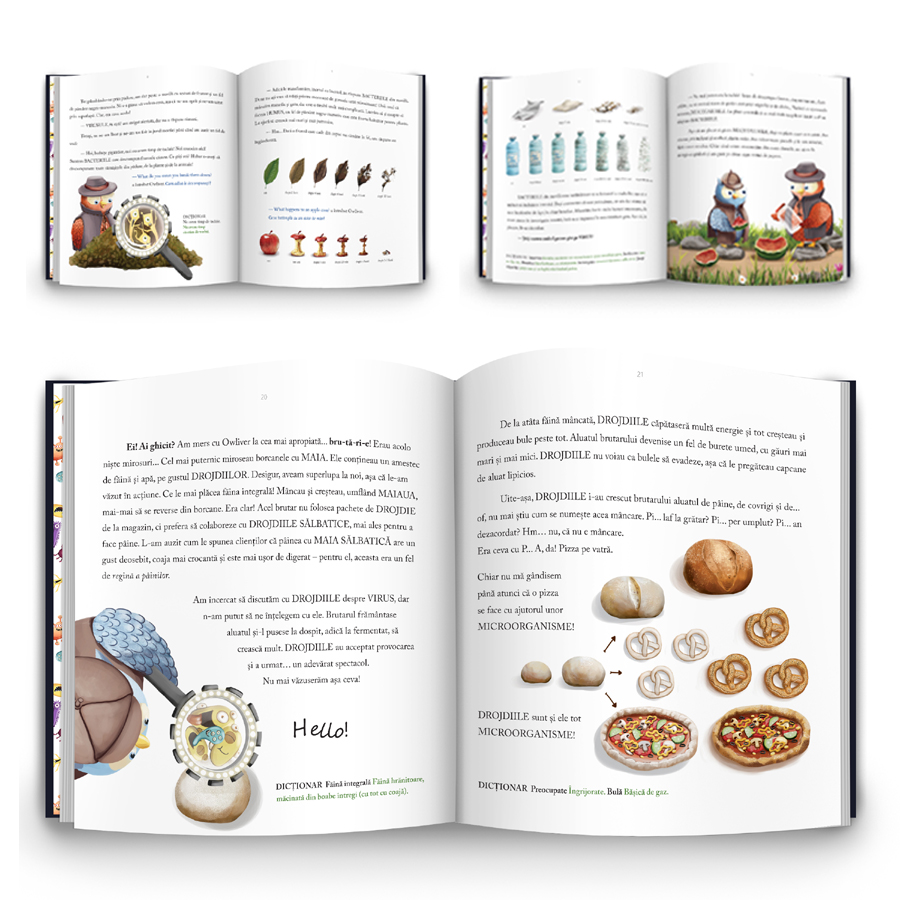 Bulversat de atâtea restricţii şi crize sanitare, un copil îi trimite Buhăi o scrisoare şi o roagă să îi spună „Ce este un virus?“. Cum nici ea nu ştie răspunsul, Buha decide să devină detectiv şi să facă investigaţii împreună cu Owliver. Dar până să afle care e treaba cu virusurile, află mai întâi cu ce se ocupă bacteriile, ce sunt mucegaiurile şi drojdiile, cum se fac murăturile, ce sunt fungii şi protozoarele, dar şi multe informaţii utile despre flora microbiană, placa dentară, sistemul imunitar, sistemul digestiv, despre prevenţie, infectare, boală şi vindecare, despre igiena casei şi a corpului, despre spălatul corect pe dinţi, ce înseamnă epidemie, pandemie, care e treaba cu coronavirusul, despre microorganismele patogene vs. cele benefice, despre importanţa alimentaţiei sănătoase şi multe altele.