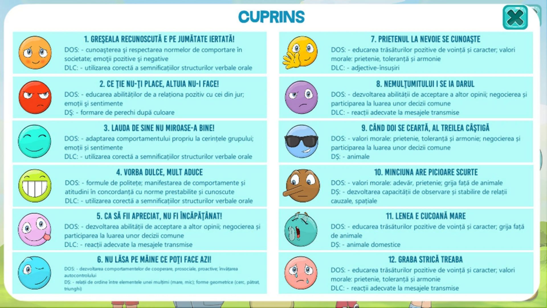 DOS: educarea trăsăturilor pozitive de voință și caracter; valori morale: prietenie, toleranță și armonie