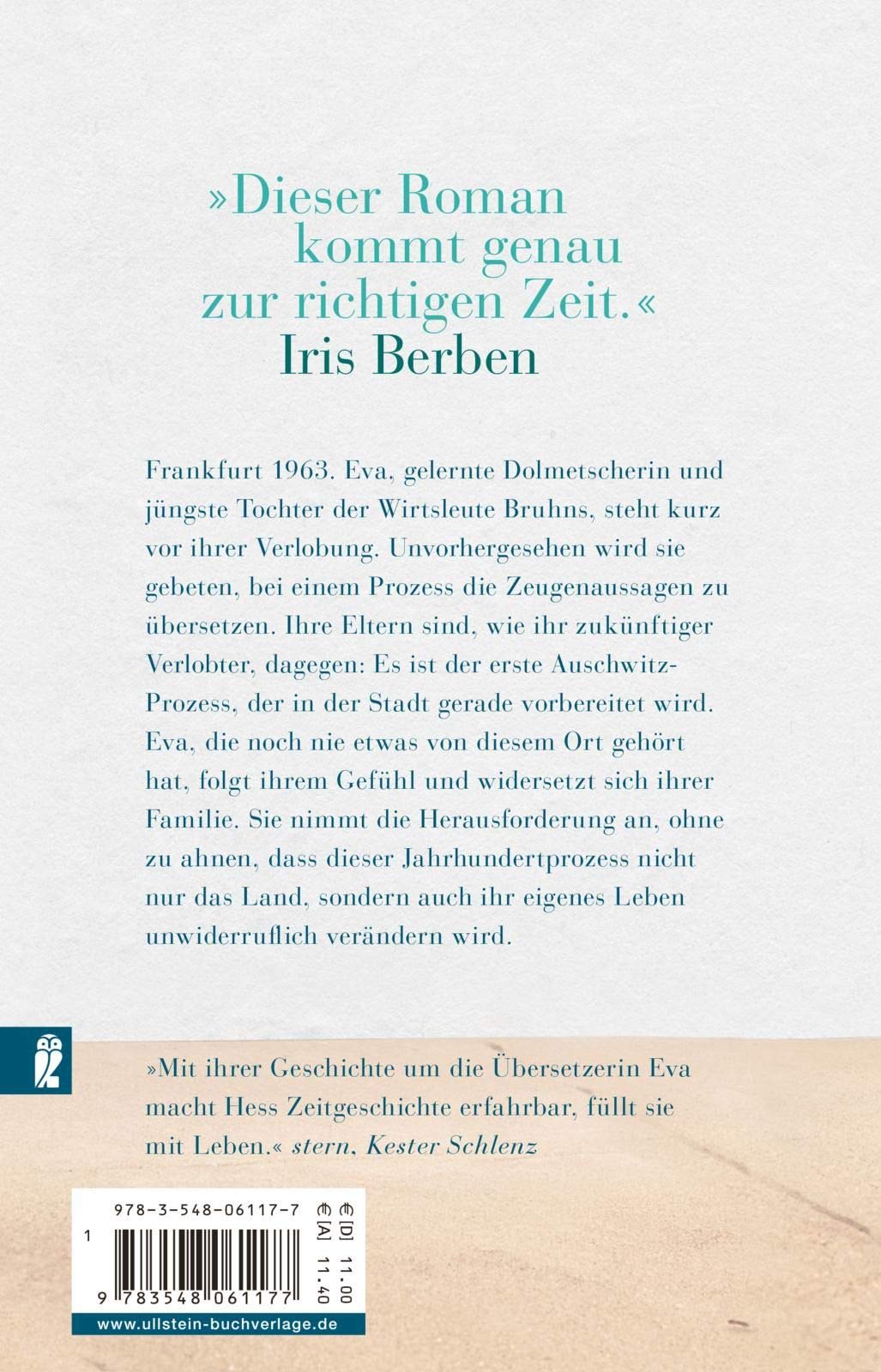 Frankfurt 1963. Eva, gelernte Dolmetscherin und jüngste Tochter der Wirtsleute Bruhns, steht kurz vor ihrer Verlobung. Unvorhergesehen wird sie gebeten, bei einem Prozess die Zeugenaussagen zu übersetzen. Ihre Eltern sind, wie ihr zukünftiger Verlobter, dagegen: Es ist der erste Auschwitz-Prozess, der in der Stadt gerade vorbereitet wird. Eva, die noch nie etwas von diesem Ort gehört hat, folgt ihrem Gefühl und widersetzt sich ihrer Familie. Sie nimmt die Herausforderung an, ohne zu ahnen, dass dieser Jahrhundertprozess nicht nur das Land, sondern auch ihr eigenes Leben unwiderruflich verändern wird.