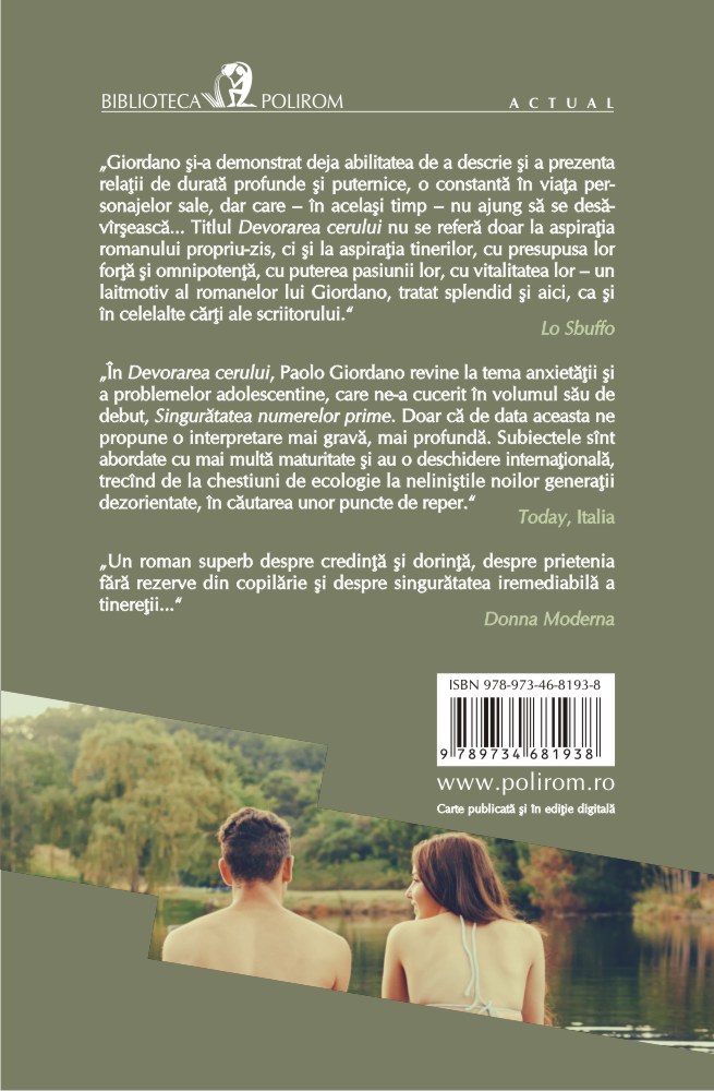 „În Devorarea cerului, Paolo Giordano revine la tema anxietăţii şi a problemelor adolescentine, care ne-a cucerit în volumul său de debut, Singurătatea numerelor prime. Doar că de data aceasta ne propune o interpretare mai gravă, mai profundă. Subiectele sînt abordate cu mai multă maturitate şi au o deschidere internaţională, trecînd de la chestiuni de ecologie la neliniştile noilor generaţii dezorientate, în căutarea unor puncte de reper.” (Today, Italia)