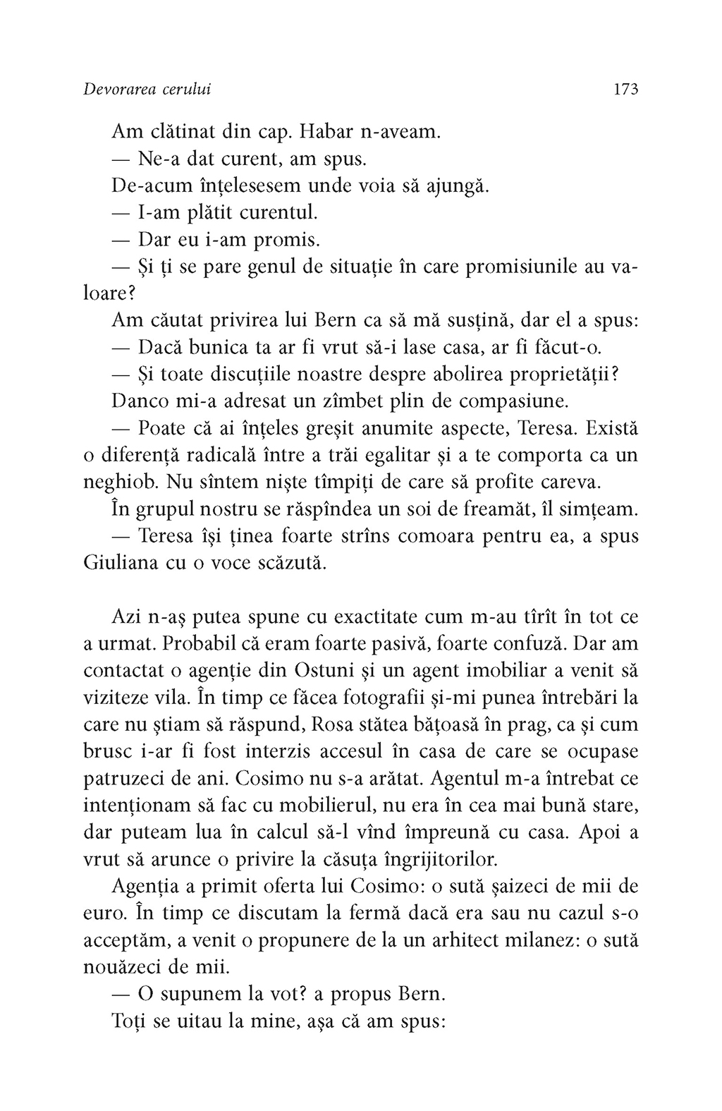 La vila bunicii sale din sudul Italiei, Teresa surprinde într-o noapte trei băieţi care se scaldă goi în piscina din curte, după ce s-au furişat peste gardul proprietăţii. Ea încă nu ştie, dar cei trei băieţi care cresc împreună ca fraţii, deşi nu sînt fraţi – îi vor marca destinul, aşa cum şi ea le va influenţa viitorul, uneori tragic, alteori doar tulbure. Cei trei băieţi trăiesc la o fermă din apropiere, sub oblăduirea lui Cesare, tatăl unuia dintre ei şi părintele spiritual al tuturor. Îndrăgostită de unul dintre ei, năvalnicul Bern, Teresa va trăi următorii douăzeci de ani o poveste de dragoste frenetică, plină de bucurii, dar şi de ratări şi taine funeste. Simbolică pentru anvergura întregului roman este tentativa eşuată a unui grup de tineri de a crea un paradis terestru la ferma lui Cesare. Istoria micii lor utopii ecologiste ilustrează contradicţiile, obsesiile şi tensiunile lumii contemporane. Un roman despre visurile, idealurile şi dorinţele necontrolate ale adolescenţei, despre complexitatea relaţiilor dintre tineri şi fragilitatea lor, despre iubire şi moarte violentă, Devorarea cerului prezintă, în acelaşi timp, lumea în care trăim, labilitatea credinţelor de orice fel şi, mai mult decît orice, căutarea încrîncenată a unui sens al vieţii.
