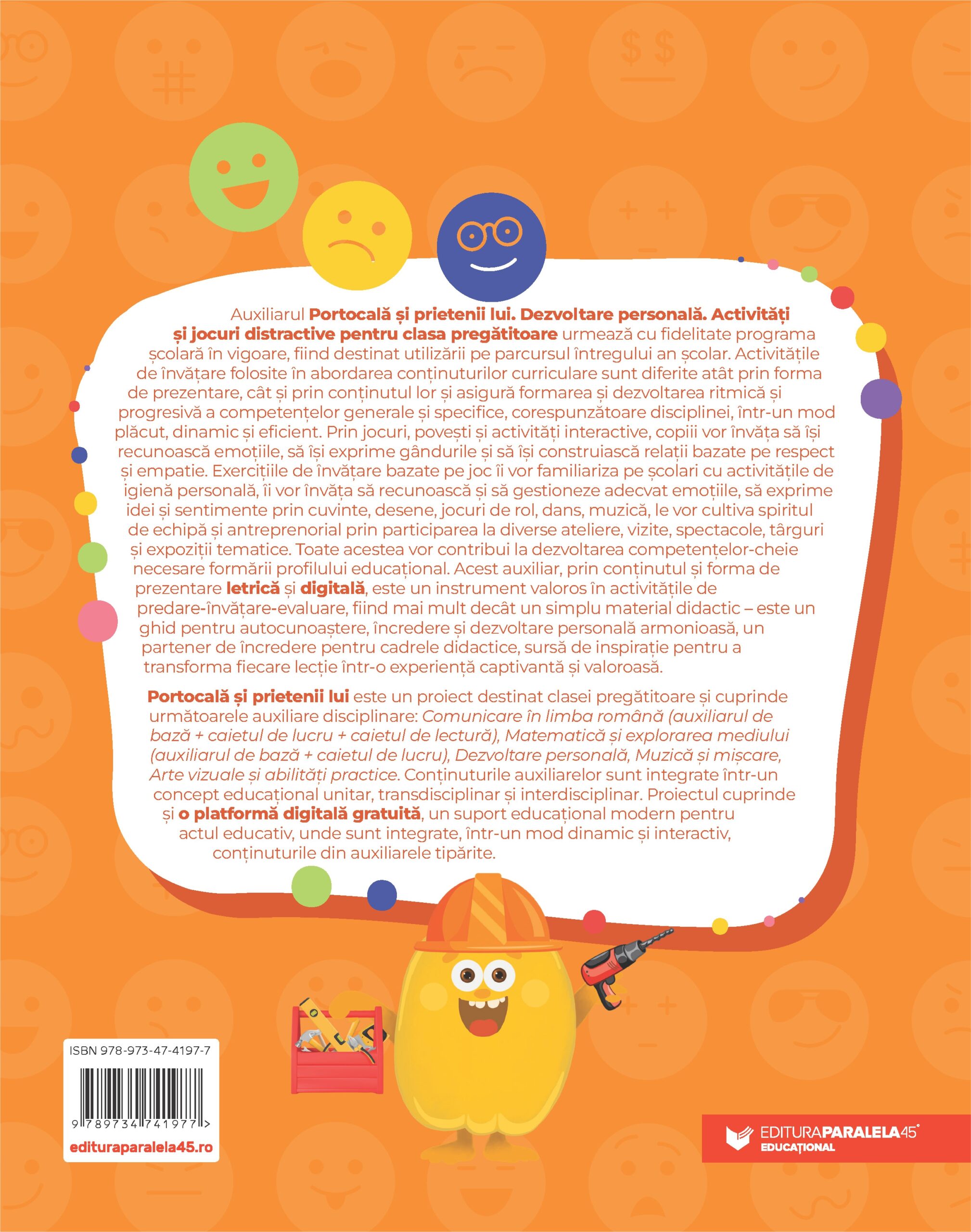 Auxiliarul Portocală și prietenii lui. Dezvoltare personală. Activități și jocuri distractive pentru clasa pregătitoare urmează cu fidelitate programa școlară în vigoare, fiind destinat utilizării pe parcursul întregului an școlar.