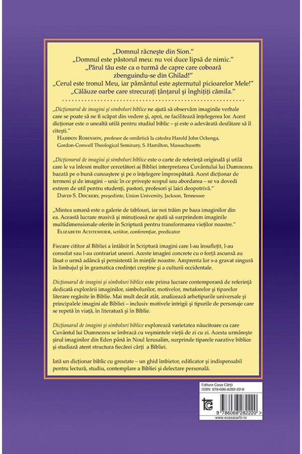 Acest dictionar, cu toate ca are un numar de aproximativ 850 de articole, nu este exhaustiv. Constatarea aceasta dovedeste cat de vasta si de diversa este multimea imaginilor biblice si cat de limitate sunt timpul si energia redactorilor si, la fel, ale editurii. Este intotdeauna provocatoare crearea unei lucrari de referinta intr-un domeniu in care niciun predecesor nu a instituit un „canon” al intrarilor. La fel, poate fi o adevarata aventura pentru redactorii care intalnesc pe parcursul lucrarii mereu alte perspective si unghiuri de vedere – punandu-le si la dispozitia altora. Insa dupa sapte ani de planificari si munca – si o munca mult mai de durata decat s-a estimat initial –, a sosit timpul sa ne oprim, sa lasam lucrurile asa cum sunt si sa publicam. Ne consolam cu gandul marinimos ca viitorii revizori vor avea ce sa invete de la noi si vor cladi pe acest fundament. si credem ca cititorii nostri, atunci cand vor lucra cu acest dictionar, vor vedea ca se pot aventura singuri si pot sa exploreze alte fatete ale imagisticii biblice.