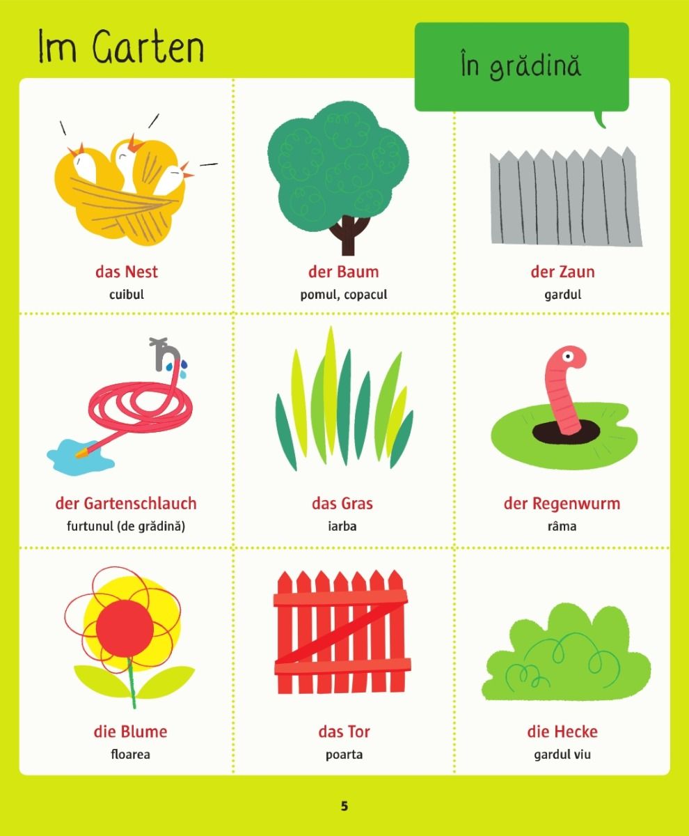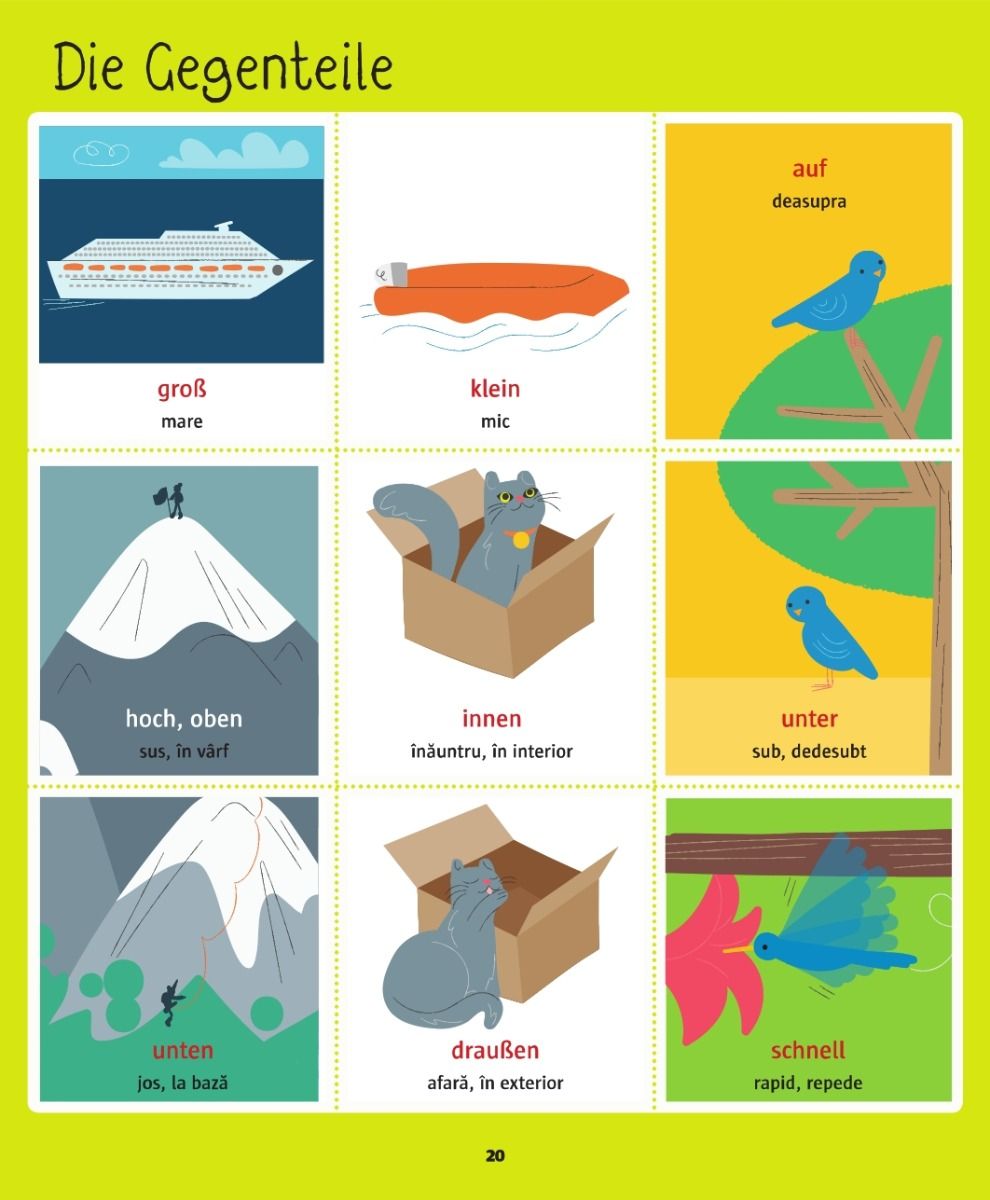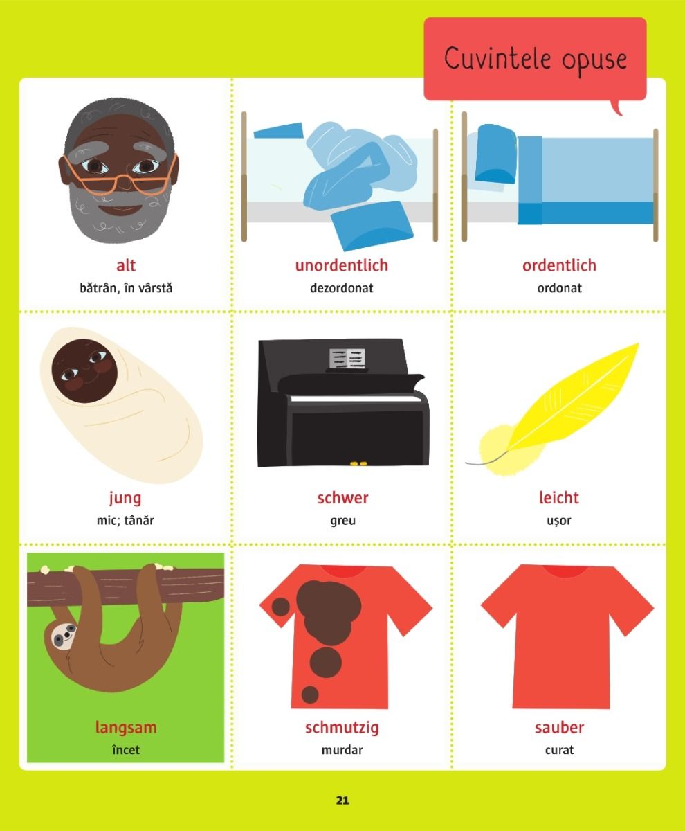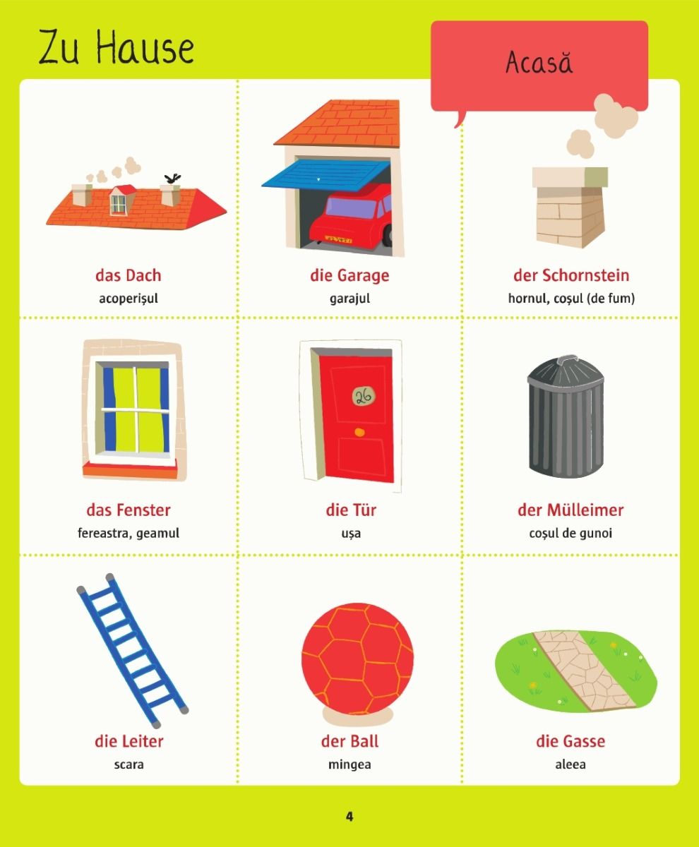 Organizat pe diverse teme, acest dicţionar ilustrat este uşor de consultat şi se adresează copiilor care învaţă primele lor noţiuni în limba germană. Cei mici vor găsi aici cele mai importante cuvinte din vocabularul de bază al acestei limbi. Ele sunt însoţite de traducerile lor în română şi vor reprezenta un prim pas în procesul de învăţare a limbii germane.
