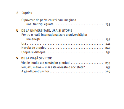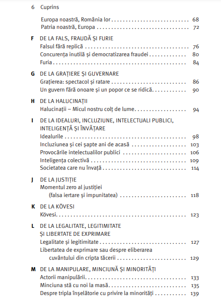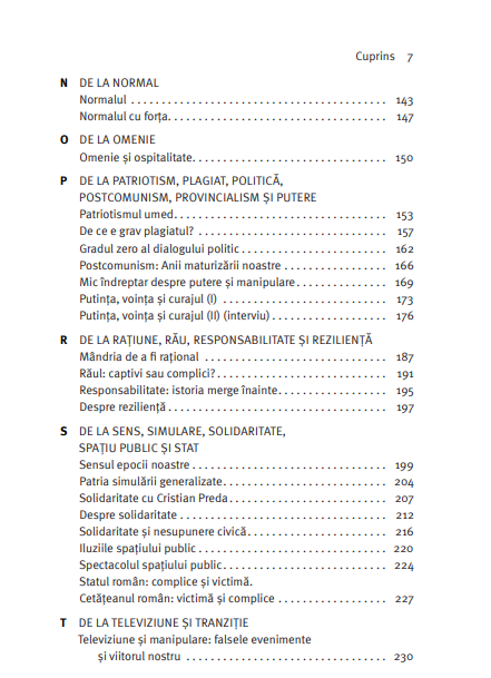 „Am trăit aceşti ani la o intensitate fără seamăn: abuzurile, ticăloşiile, declaraţiile aberante ori dezvăluirile revoltătoare au fost, fiecare în parte, tot atâtea motive pentru a mă solidariza cu o societate civilă mereu activă şi mereu ameninţată, cu grupuri sau persoane expuse linşajului public sau defăimării. Au fost, deopotrivă, pretexte pentru a îndigui cât se poate prin analiză lucidă revărsările de ură, de frică, de laşitate ori de conformism care păreau să sufoce România zi după zi, aducând, atât cât mi-a stat în putinţă, un elogiu raţiunii, educaţiei şi declarându-mi încrederea necondiţionată în forţa argumentelor limpezi şi precis exprimate. Am scris de multe ori frenetic, transformând scrisul într-un soi de terapie prin care îmi făceam mie suportabilă o societate pe care o simţeam în acelaşi timp foarte străină şi totuşi copleşitoare, am scris mânat de tristeţe sau de indignare, fără a mă eschiva de la responsabilitatea pe care mi-am luat-o singur, fără mandat şi fără constrângeri, de a fi un intelectual public.“ — CIPRIAN MIHALI