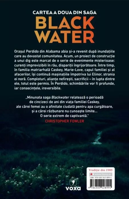 „Minunata saga Blackwater relatează o perioadă de cincizeci de ani din viața familiei Caskey, ale cărei femei au o afinitate ciudată pentru apa curgătoare, și a cărei răzbunare nu cunoaște limite... O serie extrem de captivantă.“ CHRISTOPHER FOWLER