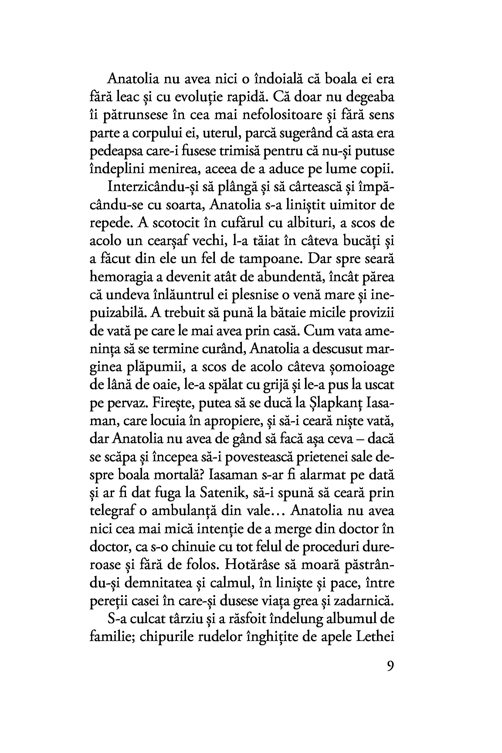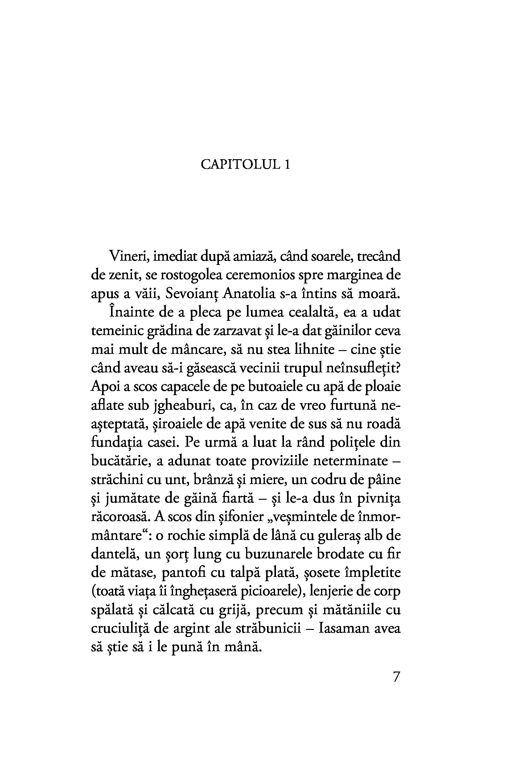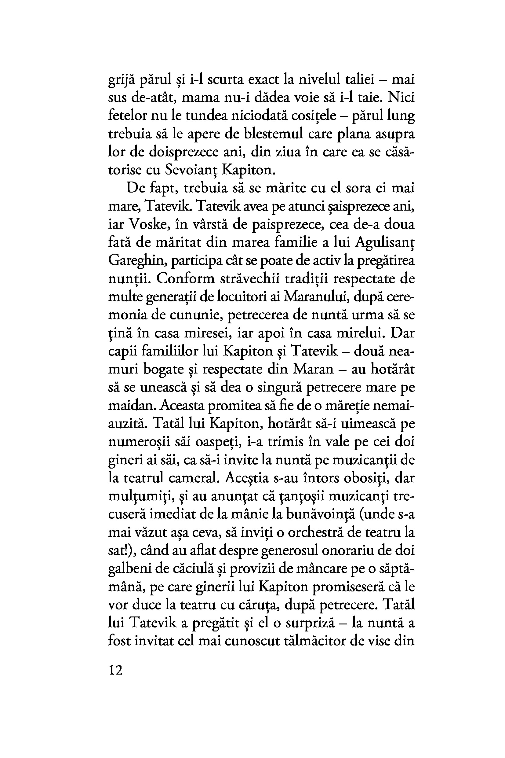 O lume în care personajele și întâmplările conturează o realitate simbolică, extrasă din amănuntele vieții de zi cu zi, o iubire târzie care salvează lumea, un sat de piatră aflat pe vârful unui munte armean, unde magia și misterul și-au păstrat neatinse puterile. Cu o somptuoasă imaginație și o atenție deosebită pentru detaliile cele mai fine, Narine Abgarian construiește un univers în care cititorul își dorește să zăbovească mult după ce povestea s-a sfârșit.