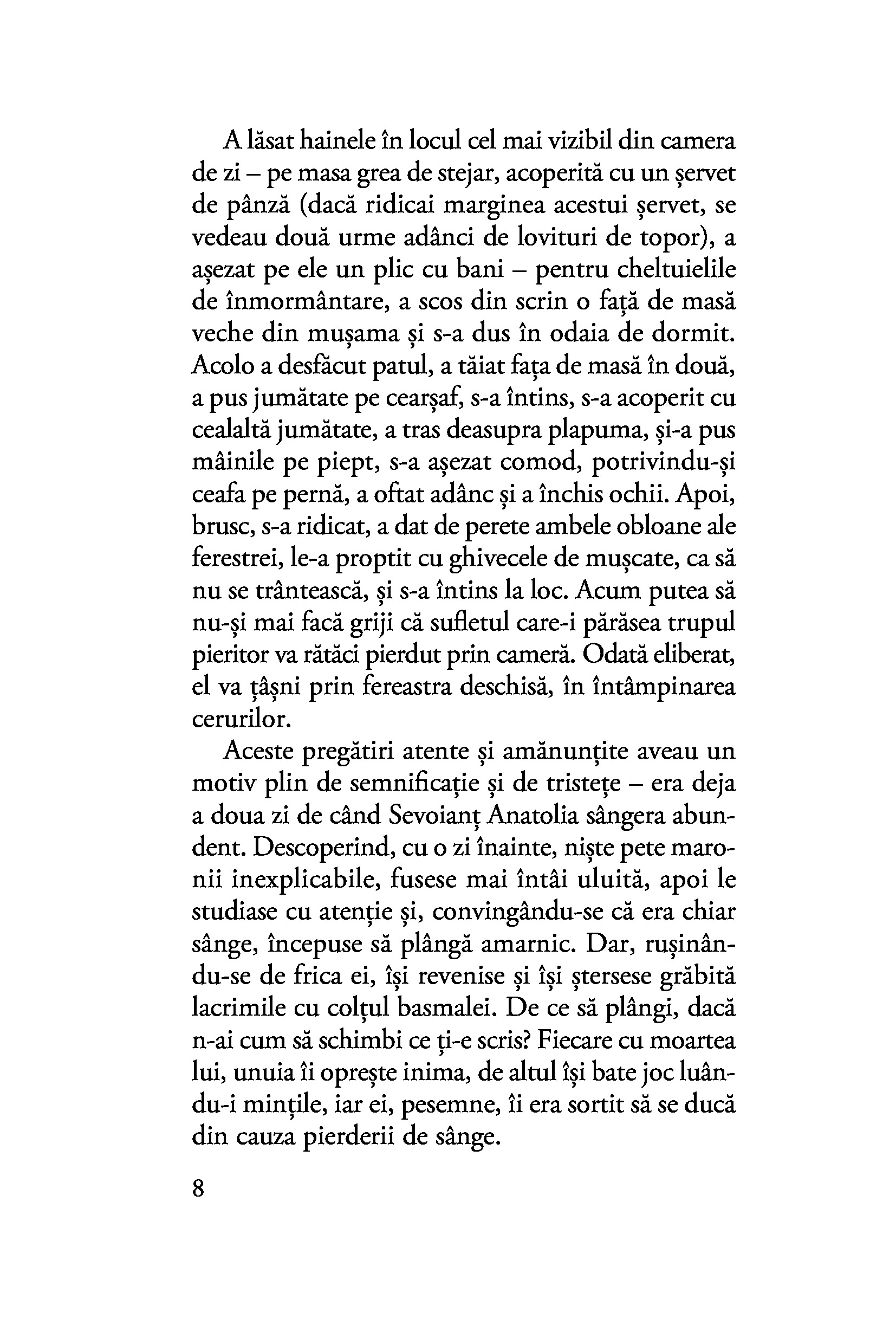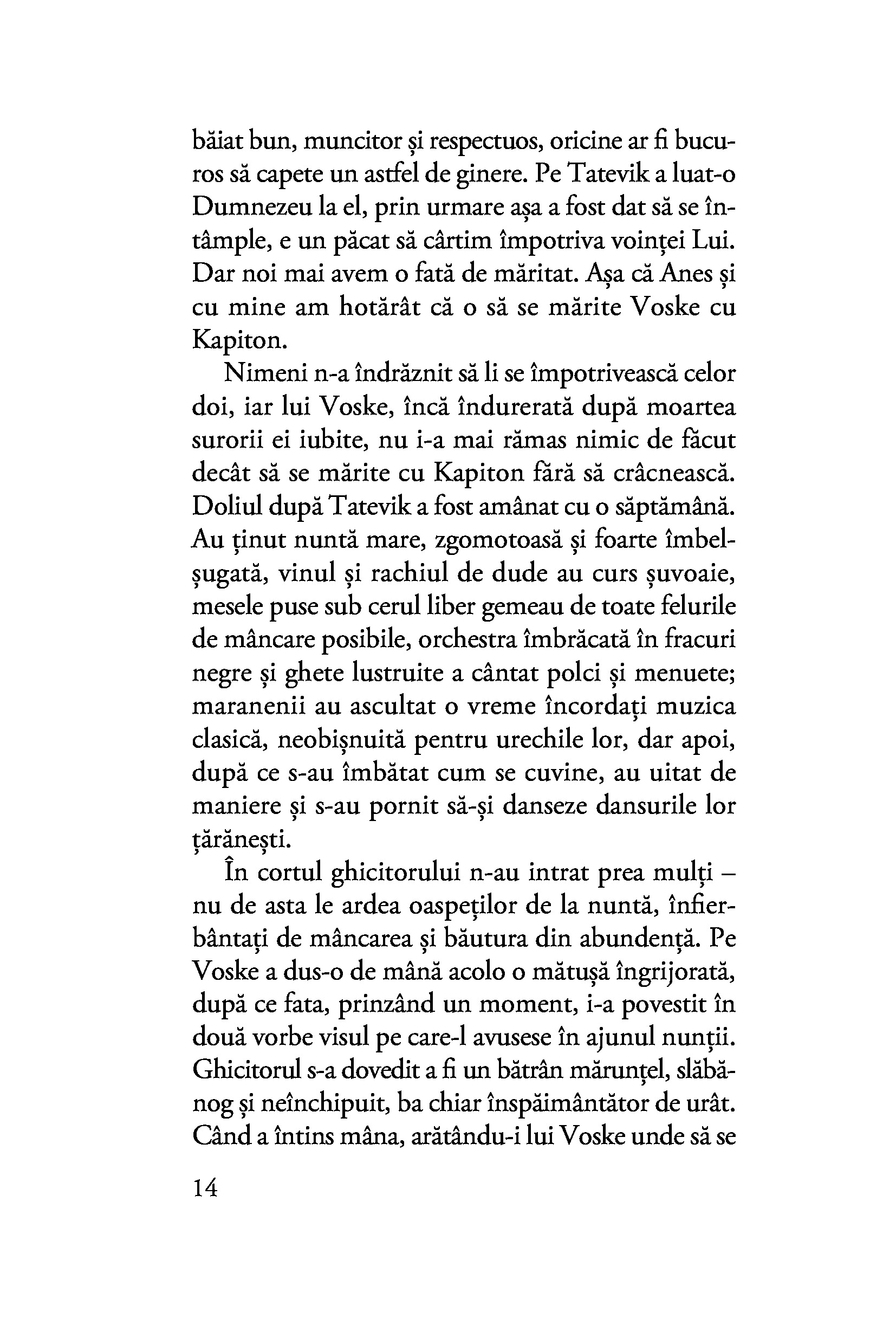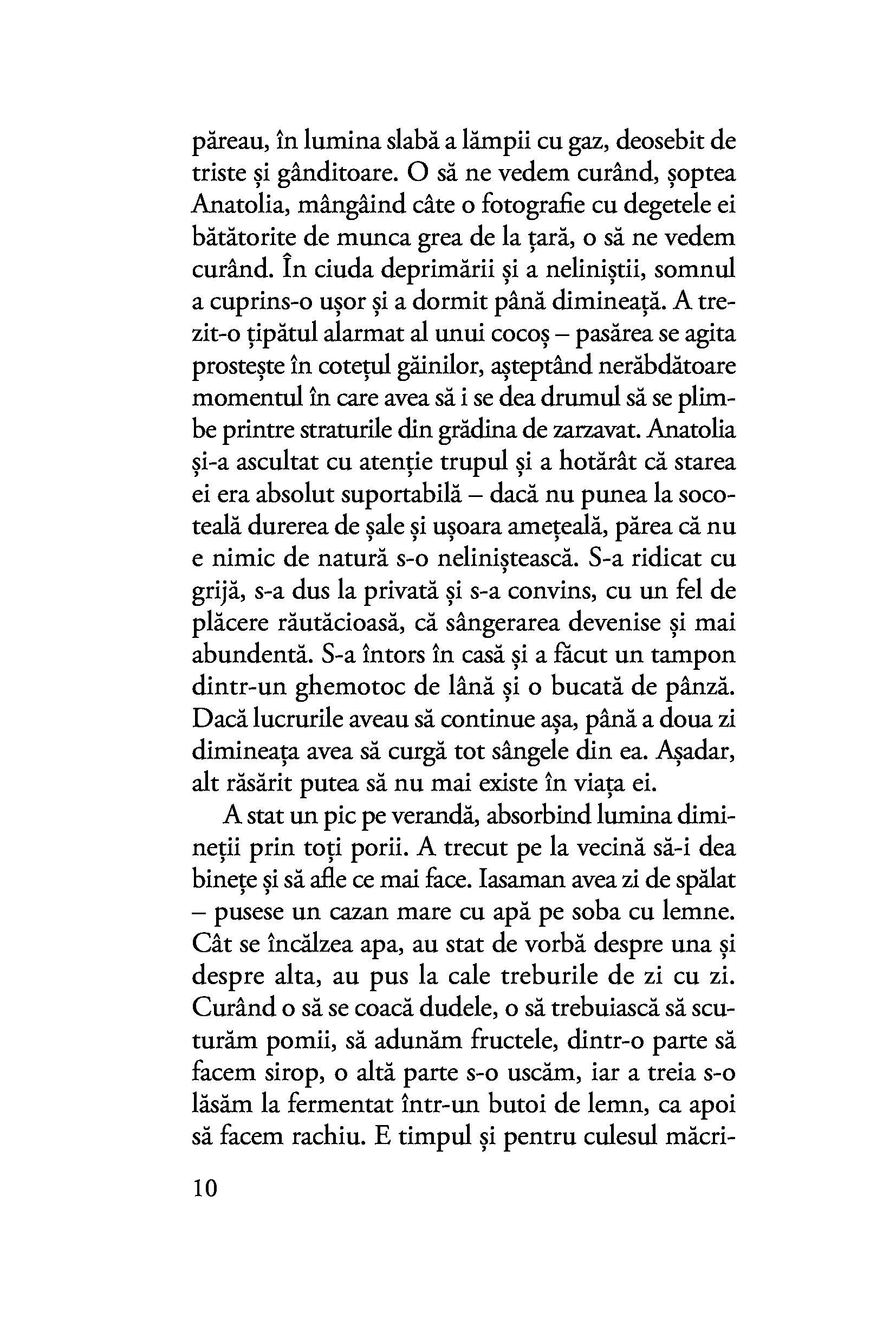 O lume în care personajele și întâmplările conturează o realitate simbolică, extrasă din amănuntele vieții de zi cu zi, o iubire târzie care salvează lumea, un sat de piatră aflat pe vârful unui munte armean, unde magia și misterul și-au păstrat neatinse puterile. Cu o somptuoasă imaginație și o atenție deosebită pentru detaliile cele mai fine, Narine Abgarian construiește un univers în care cititorul își dorește să zăbovească mult după ce povestea s-a sfârșit.