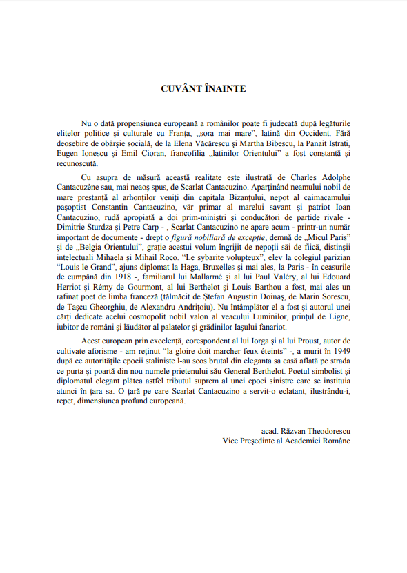 Volumul prezinta viata şi opera remarcabila, dar mai putin cunoscuta a lui Scarlat A. Cantacuzino (nume literar Charles-Adolphe Cantacuzène, numit de prieteni Ch-Ad), o personalitate romana cu dimensiuni europene. Personalitatea lui se afla la confluenta intre diplomatie şi literatura (poezie, critica literara, eseuri, aforisme, bibliofil), continuand traditia culturala şi istorica a familiei. Sunt reunite marturii selectate din publicatii şi materiale inedite despre lucrarile literare şi activitatile diplomatice ce dau un context viu al vietii şi activitatii distinsului diplomat şi poet. Cartea include marturiile lui Ch-Ad in propriile lui cuvinte despre opera, diplomatia, prietenia şi corespondenta sa in versuri cu alti scriitori.