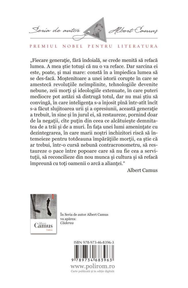 „Fiecare generaţie, fără îndoială, se crede menită să refacă lumea. A mea ştie totuşi că nu o va reface. Dar sarcina ei este, poate, şi mai mare: constă în a împiedica lumea să se desfacă. Moştenitoare a unei istorii corupte în care se amestecă revoluţiile neîmplinite, tehnologiile devenite nebune, zeii morţi şi ideologiile extenuate, în care puteri mediocre pot astăzi să distrugă totul, dar nu mai ştiu să convingă, în care inteligenţa s-a înjosit pînă într-atît încît s-a făcut slujitoarea urii şi a opresiunii, această generaţie a trebuit, în sine şi în jurul ei, să restaureze, pornind doar de la negaţii, cîte puţin din ceea ce alcătuieşte demnitatea de a trăi şi de a muri. În faţa unei lumi ameninţate cu dezintegrarea, în care marii noştri inchizitori riscă să întemeieze pentru totdeauna împărăţiile morţii, ea ştie că ar trebui, într-o cursă nebună contracronometru, să restaureze o pace între popoare care să nu fie cea a servituţii, să reconcilieze din nou munca şi cultura şi să refacă împreună cu toţi oamenii o arcă a alianţei.” (Albert Camus)