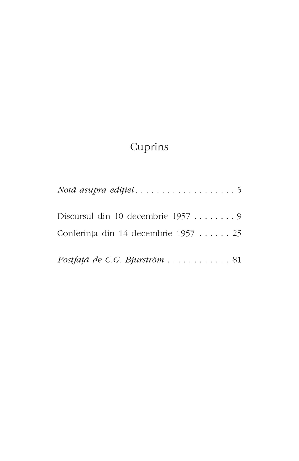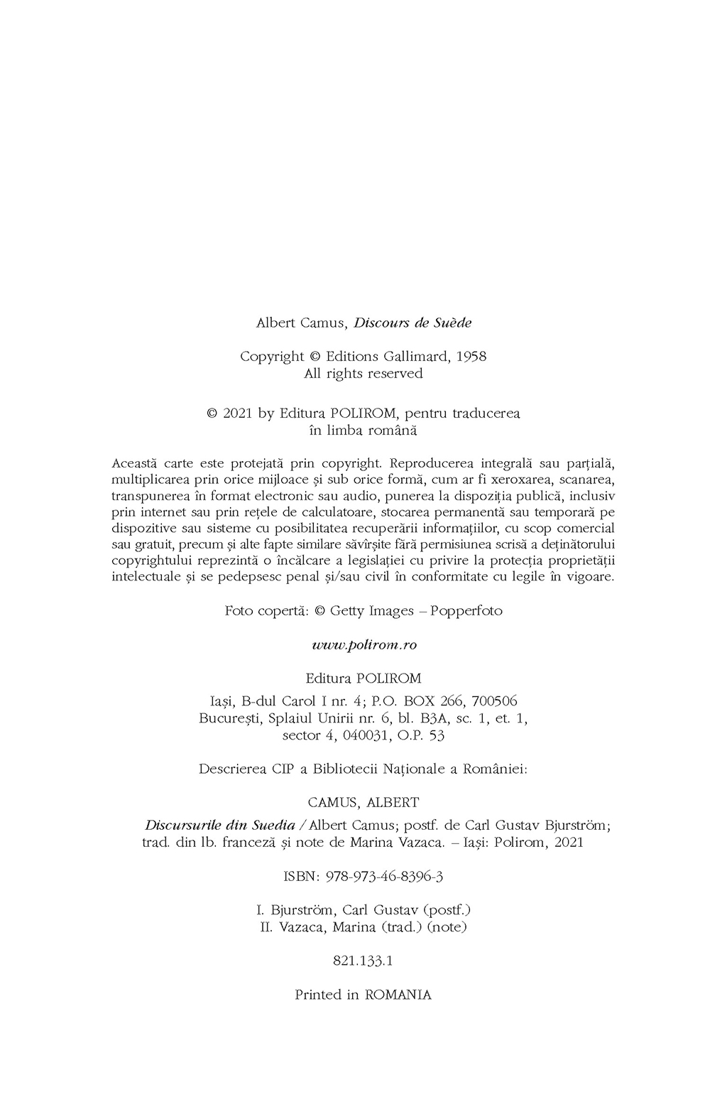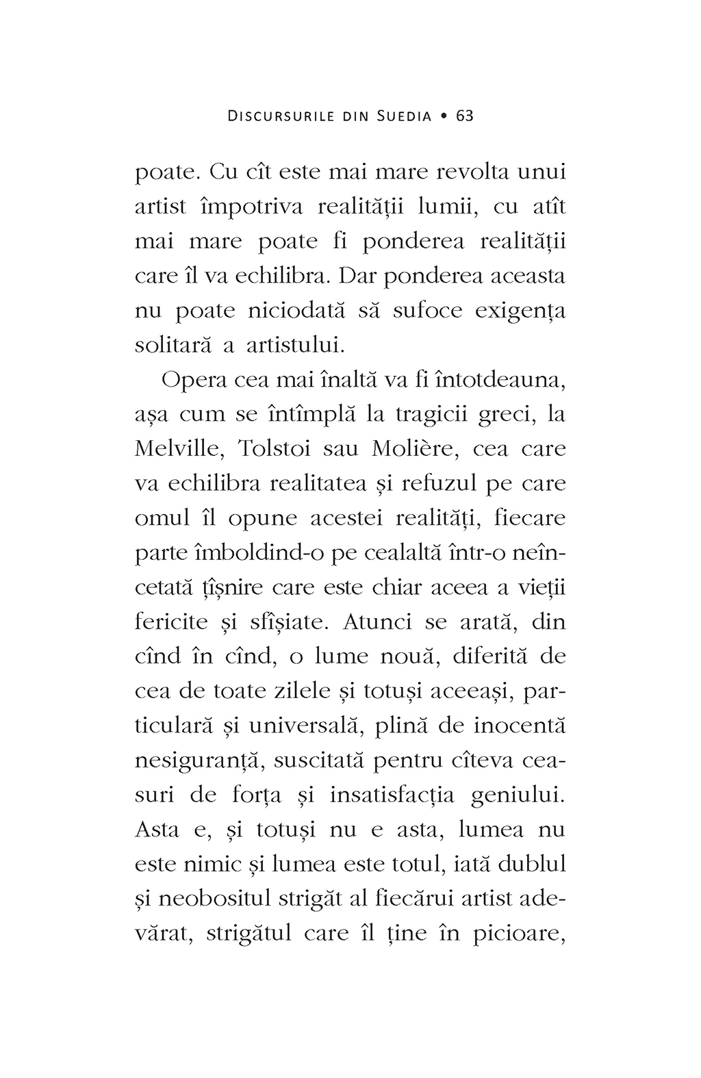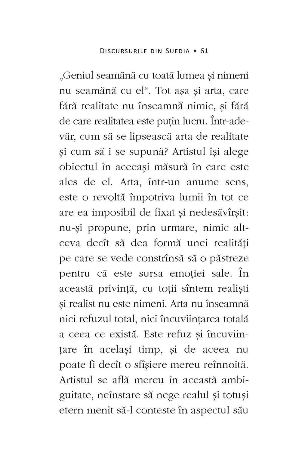 Pentru prima dată în limba română, apar reunite sub titlul Discursurile din Suedia discursul rostit de Albert Camus la Stockholm după ceremonia decernării Premiului Nobel pentru Literatură şi conferinţa susţinută în faţa studenţilor de la Universitatea din Uppsala în decembrie 1957. Ele nu au putut fi traduse înainte de 1989 pentru că viziunea lui Camus despre misiunea artistului în societate se concretizează aici într-o critică explicită a realismului socialist şi a tendinţelor de orientare ideologică a culturii. În bibliotecile publice din România, ediţia franceză a Discursurilor din Suedia (ca şi cea a Omului revoltat) era catalogată în aşa-numitul „fond special”, nefiind accesibilă decît pe baza unei aprobări oficiale.