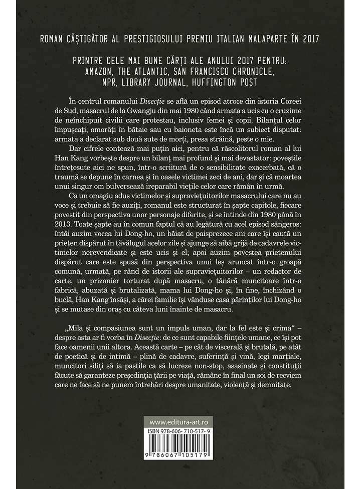 „Mila și compasiunea sunt un impuls uman, dar la fel este și crima” - despre asta ar fi vorba în Disecție: de ce sunt capabile ființele umane, ce își pot face oamenii unii altora. Această carte - pe cât de viscerală și brutală, pe atât de poetică și de intimă - plină de cadavre, suferință, doliu și vină, legi marțiale, muncitori siliți să ia pastile ca să lucreze non-stop, asasinate și constituții făcute să garanteze președinția țării pe viață, rămâne în final un soi de recviem care ne face să ne punem întrebări despre umanitate, violență și demnitate.