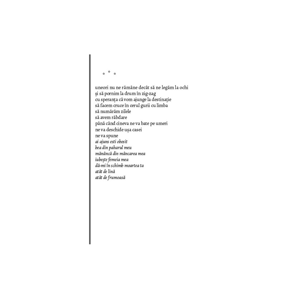 Nu vorbim, insa, doar de o noua carte a Andrei Mateuca, ce s-ar adauga, numeric, cronologic si cuminte, celorlalte trei, ci cred ca se impune, de la bun inceput, o remarca, o subliniere: acest volum este - perceptie pe care mi-o asum din start - cea mai rotunda carte, de pana, acum, a autoarei, intelegand prin aceasta caracterizare (plastica/vizuala...), asa cum anticipam, un evident plus valoric, dar si o perspectiva integratoare, in acceptiunea artictdarii, tot mai pregnante, mai curajoase a unui areal poetic, prefigurat, conturat deja in volumele anterioare. In esenta, traversarea poemelor ne (re)pune in contact cu un anumit spatiu tematic, parand, la un prim strat al lecturii, predominant erotic, dar "deconspirand", in subtext, valente si sugestii, conotatii mult mai bogate. Motivul timpului, uneori cu inflexiuni ale arhaitatii, ale miticului, ale religiosului, dar si ale exoticului, insinuari ale istoriei recente, motivul recognoscibil al scrisului, apoi palpitul si trepidatia vietii cotidiene in plina epoca a "invaziei" tehnologice, toate se intretes intr-un limbaj poetic pregnant, cuceritor, intr-un tot organic, convingator estetic. Cititorul va avea satisfactia sa descopere aceste ingrediente si inca altele pe cont propriu. Finalmente, (re) descoperim un spatiu personalizat de tribulatiile si "revelatifle" de zi cu zi ale unui eu poetic-existential a carui voce isi ritmeaza, isi amprenteaza discursul intr-o maniera scripturala purtand deja marca Andra Mateuca. O poeta care, de la o iesire editoriala la alta, surprinde printr-o certa si provocatoare evolutie. Prin insusi pariul, totdeauna provocator, cu poezia insasi. Vad in aceasta carte toate "simptomele" ce propun, chiar definesc o poeta de cursa lunga: "Nu ma cuprinde cu bratele//am sa-mi iau zborul ca un zmeu uitat mult timp in debara.// Sau: "Vreau sa-ti scriu de departe..." Sunt doar cateva versuri ce par, ba chiar sunt premonitorii... Ar putea fi o asigurare avansata cititorului, un cec. Dar nicidecum in alb... - Eugen Bunaru