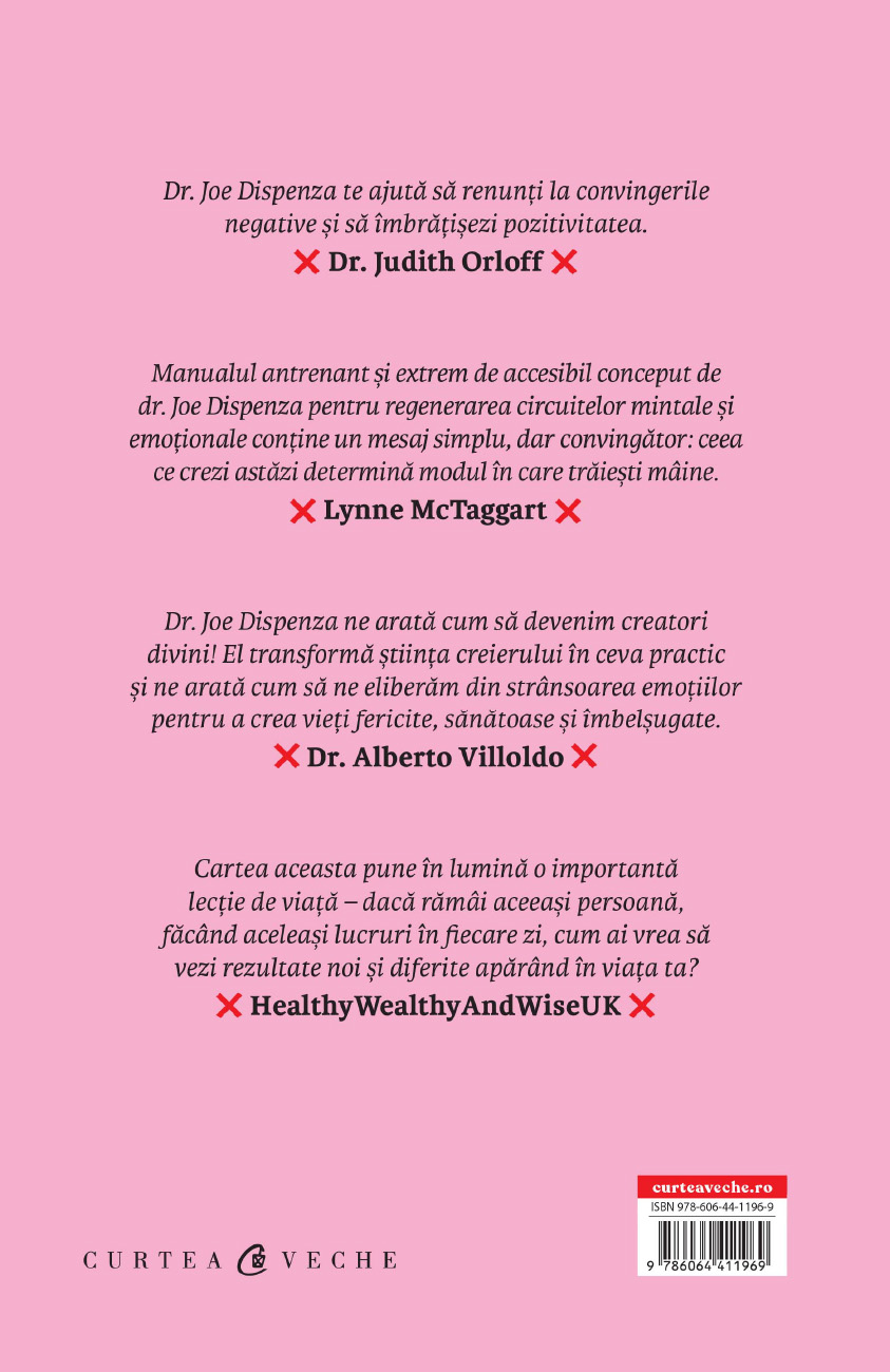 Joe Dispenza s-a născut pe 24 martie 1962. Este conferențiar, consultant și cercetător științific. Și‑a luat doctoratul în chiropractică și și‑a continuat pregătirea postuniversitară în neurologie, neuroștiințe, biologie celulară și genetică. Este mereu la curent cu ultimele noutăți din fizica cuantică și din domeniile conexe, pe care le leagă de propriile cercetări în vederea unor rezultate practice: îi ajută pe oameni să evolueze spiritual, să treacă peste greutățile vieții și chiar să se vindece de boli cronice. Ține conferințe pe întregul mapamond și, alături de alți oameni de știință, realizează experimente riguroase pe tema efectelor meditației. În calitate de consultant, dr. Joe Dispenza predă principii menite să sporească productivitatea și creativitatea. Printre companiile care au beneficiat de cunoștințele și experiența lui se numără Sony Entertainment, Gallo Vineyards și WideOpenWest Networks. A ținut conferințe în 32 de țări de pe cinci continente și a educat mii de oameni în spiritul descătușării propriului potențial. A apărut în mai multe filme docu‑ mentare cu subiect științific, iar cărțile sale s-au regăsit de-a lungul timpului în clasamentele The New York Times.