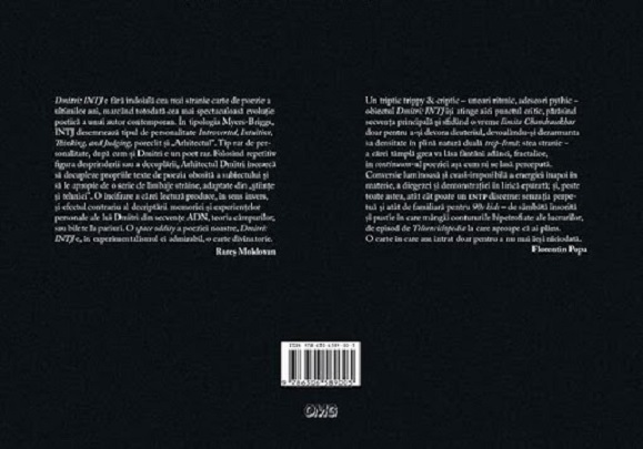 Dmitri: INTJ e fără îndoială cea mai stranie carte de poezie a ultimilor ani, marcând totodată cea mai spectaculoasă evoluție poetică a unui autor contemporan. În tipologia Myers-Briggs, INTJ desemnează tipul de personalitate Introverted, Intuitive, Thinking, and Judging, poreclit și „Arhitectul”. Tip rar de personalitate, după cum și Dmitri e un poet rar. Folosind repetitiv figura desprinderii sau a decuplării, Arhitectul Dmitri încearcă să decupleze propriile texte de poezia obosită a subiectului și să le apropie de o serie de limbaje străine, adaptate din ”științe și tehnici”. O încifrare a cărei lectură produce, în sens invers, și efectul contrariu al decriptării memoriei și experiențelor personale ale lui Dmitri din secvențe ADN, teoria câmpurilor, sau bilete la pariuri. O space oddity a poeziei noastre, Dmitri: INTJ e, în experimentalismul ei admirabil, o carte divinatorie.” - Rareș Moldovan