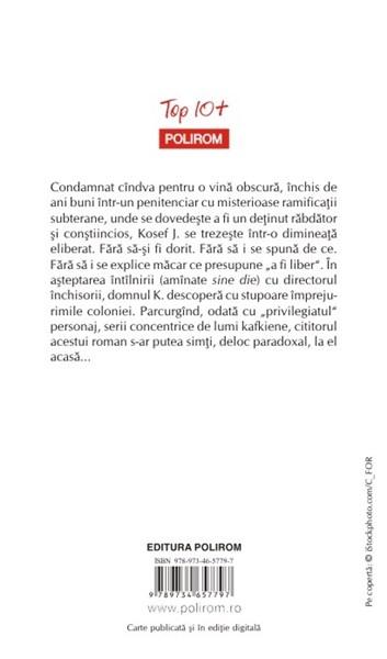 Condamnat cindva pentru o vina obscura, inchis de ani buni intr-un penitenciar cu misterioase ramificatii subterane, unde se dovedeste a fi un detinut rabdator si constiincios, Kosef J. se trezeste intr-o dimineata eliberat. Fara sa-si fi dorit. Fara sa i se spuna de ce. Fara sa i se explice macar ce presupune „a fi liber”. In asteptarea intilnirii (aminate sine die) cu directorul inchisorii, domnul K. descopera cu stupoare imprejurimile coloniei. Parcurgind, odata cu „privilegiatul” personaj, serii concentrice de lumi kafkiene, cititorul acestui roman s-ar putea simti, deloc paradoxal, la el acasa...