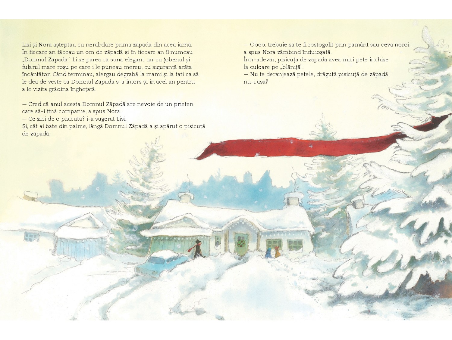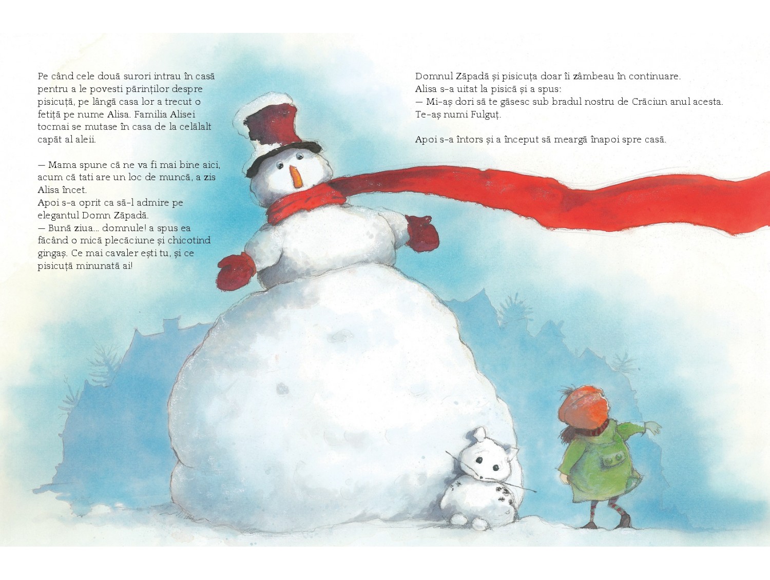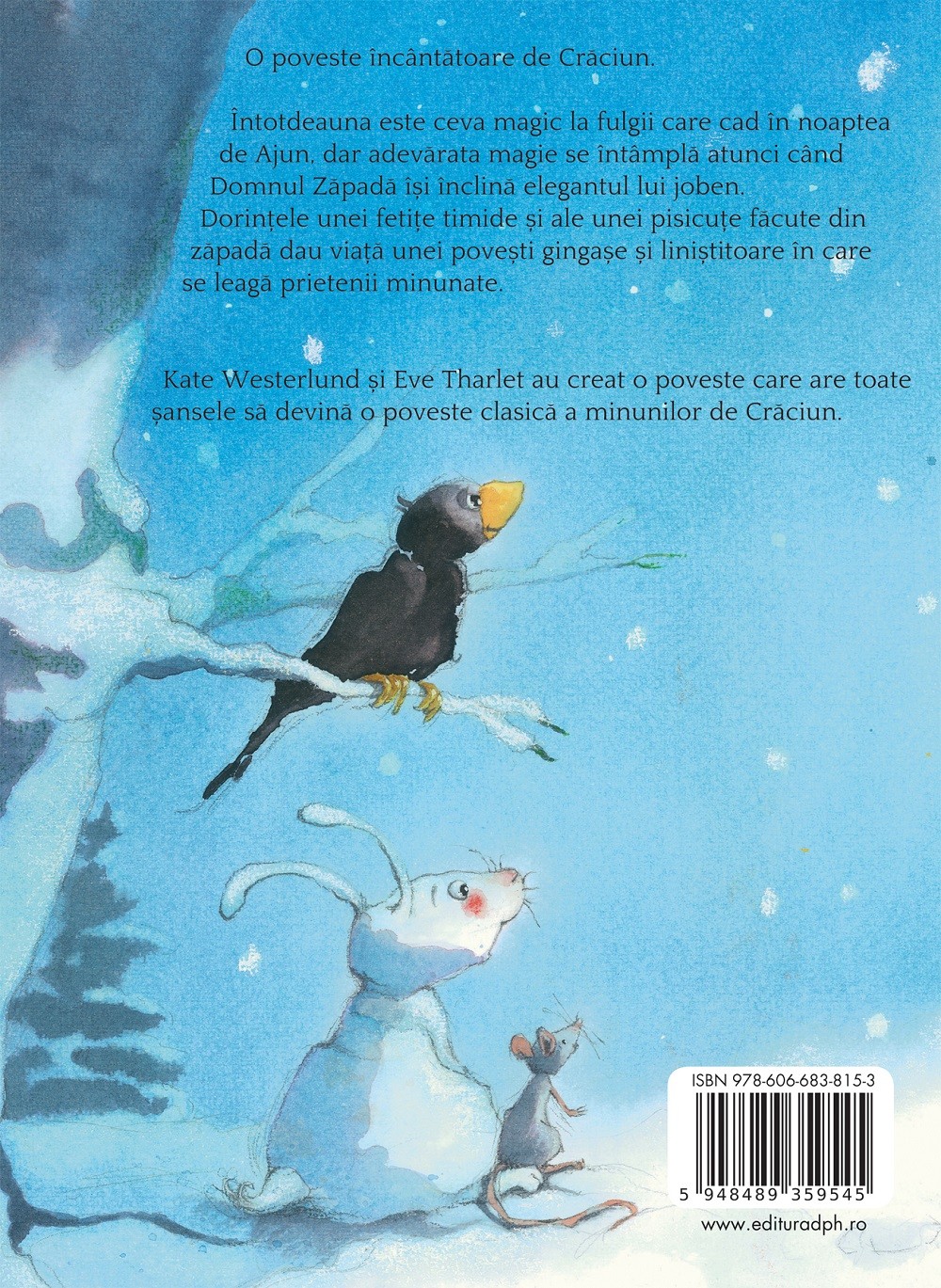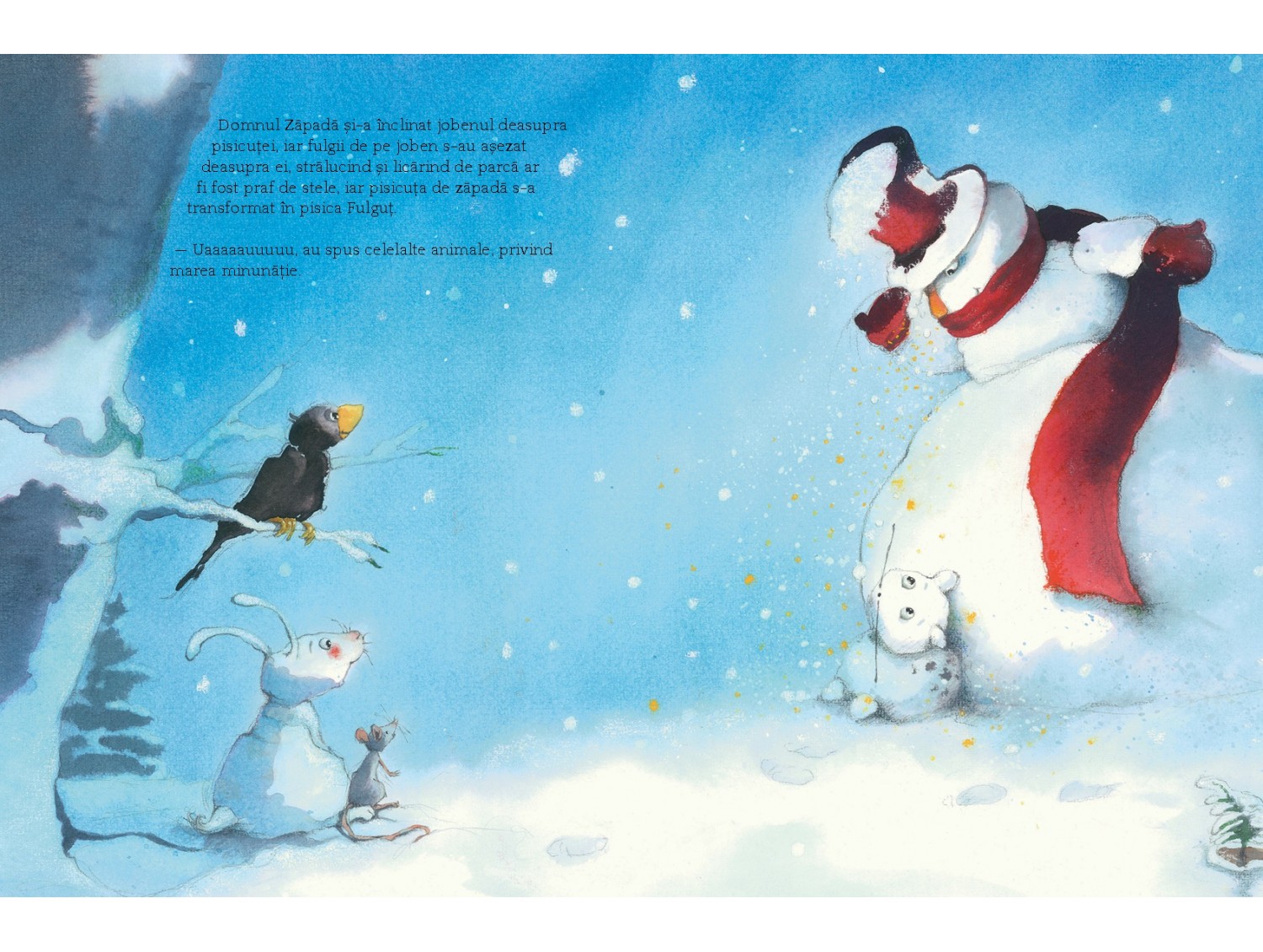 Întotdeauna este ceva magic la fulgii care cad în noaptea de Ajun, dar adevărata magie se întâmplă atunci când Domnul Zăpadă își înclină elegantul lui joben. Dorințele unei fetițe timide și ale unei pisicuțe făcute din zăpadă dau viață unei povești gingașe și liniștitoare în care se leagă prietenii minunate.