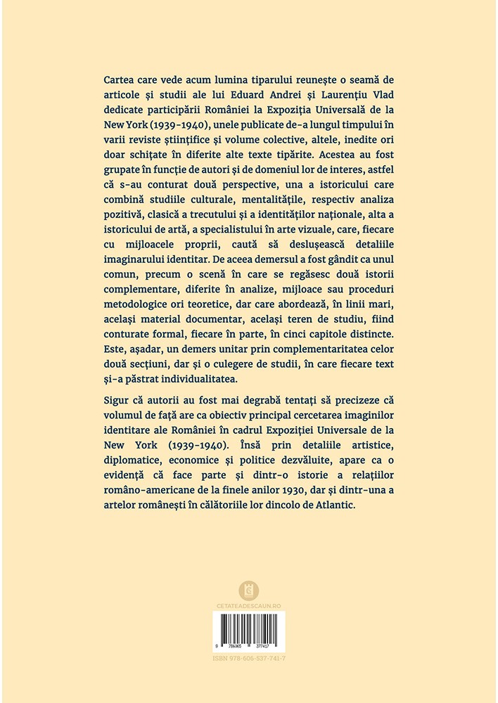 Cartea care vede acum lumina tiparului reunește o seamă de articole și studii ale lui Eduard Andrei și Laurențiu Vlad dedicate participării României la Expoziția Universală de la New York (1939-1940), unele publicate de-a lungul timpului în varii reviste științifice și volume colective, altele, inedite ori doar schițate în diferite alte texte tipărite.