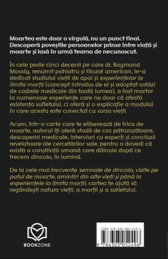 În cele peste cinci decenii pe care dr. Raymond Moody, renumit psihiatru și filozof american, le-a dedicat studiului vieții de apoi și experiențelor la limita morții (concept introdus de el și adoptat astăzi de cadrele medicale din toată lumea), a fost martor la numeroase experiențe care nu doar că atestă existența sufletului, ci oferă și o explicație a modului în care acesta este conectat cu sursa vieții.