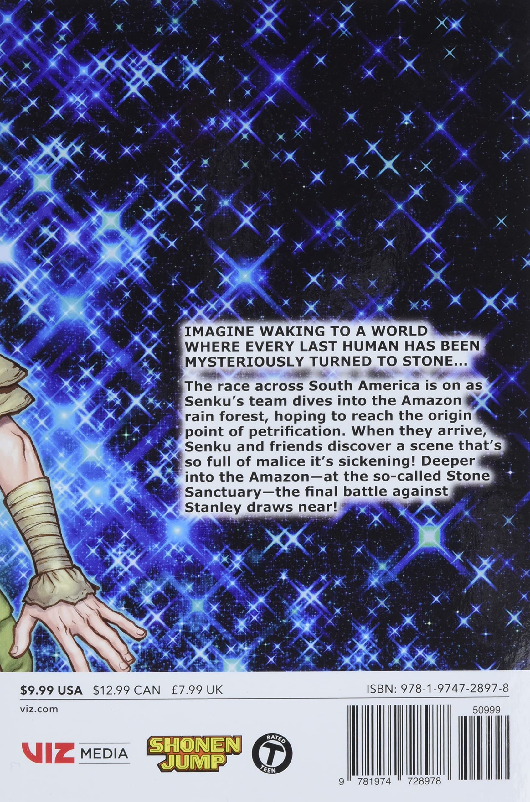 The race across South America is on as the team dives into the Amazon rain forest, hoping to reach the source of petrification. When they arrive, Senku and friends discover a scene that’s so full of malice it’s sickening! Deeper into the Amazon—at the so-called Stone Sanctuary—the final battle against Stanley draws near!
