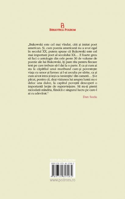 O premiera pe piata editoriala romaneasca! „Bukowski este cel mai vindut, citit si imitat poet american. Si, cum poezia americana nu a avut egal in secolul XX, putem spune ca Bukowski este cel mai important poet al secolului XX… E foarte greu sa faci o antologie din cele peste 30 de volume de poezie ale lui Bukowski, iti pare rau pentru fiecare text pe care trebuie sa-l dai la o parte. E ca si cum ai sta la capatiiul unui muribund care-si povesteste viata – cu umor si farmec – si l-ai asculta pe sarite, ca si cum ai tot intra si iesi ca nesimtitu’ din camera… Si e pacat, pentru ca, desi viziunea lui asupra lumii nu e deloc una dulce, la capatul povestii descoperi o importanta lectie de supravietuire. Sa nu-ti pierzi niciodata mindria, fiindca e singurul lucru pe care-l ai cu adevarat.” (Dan Sociu)