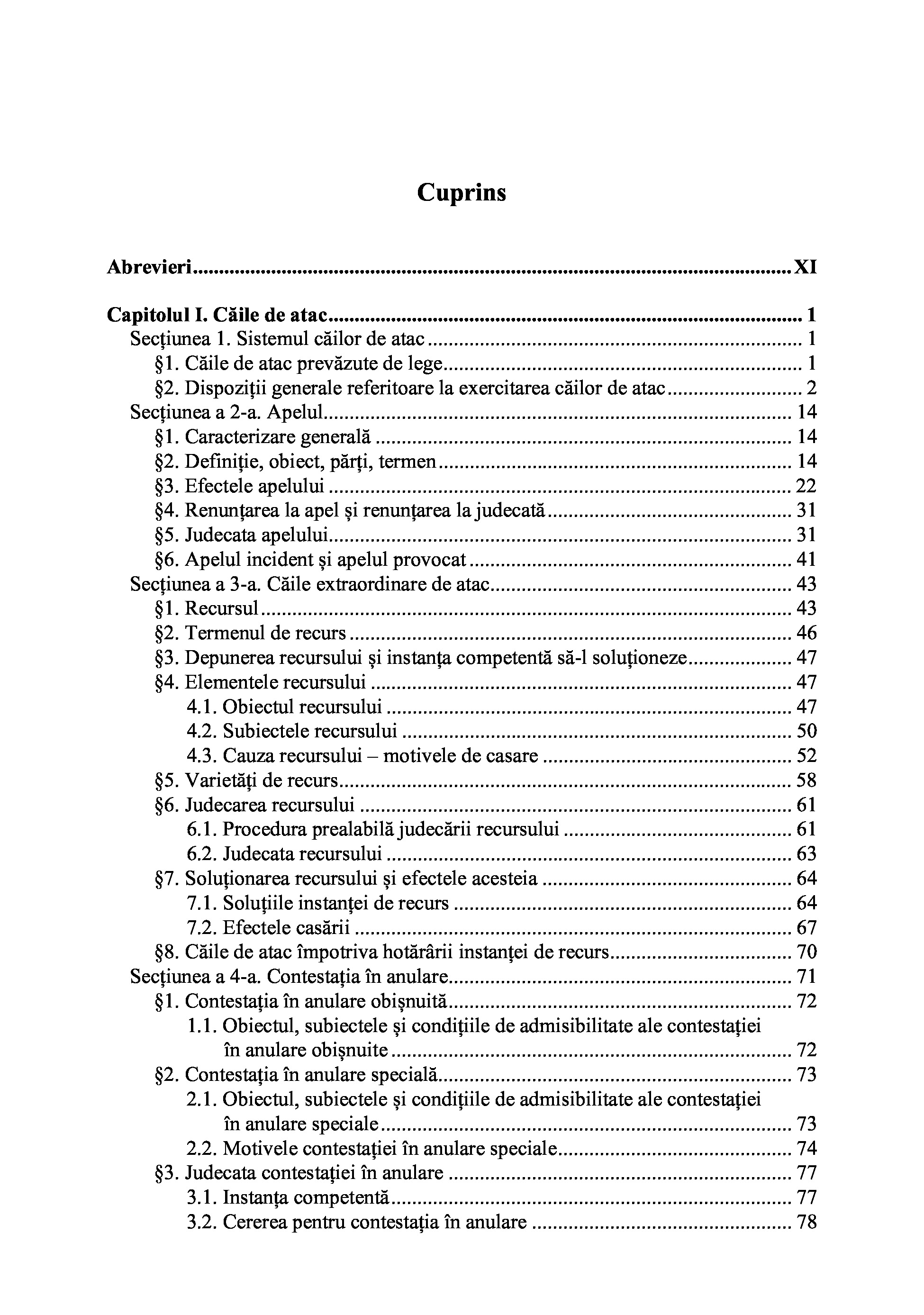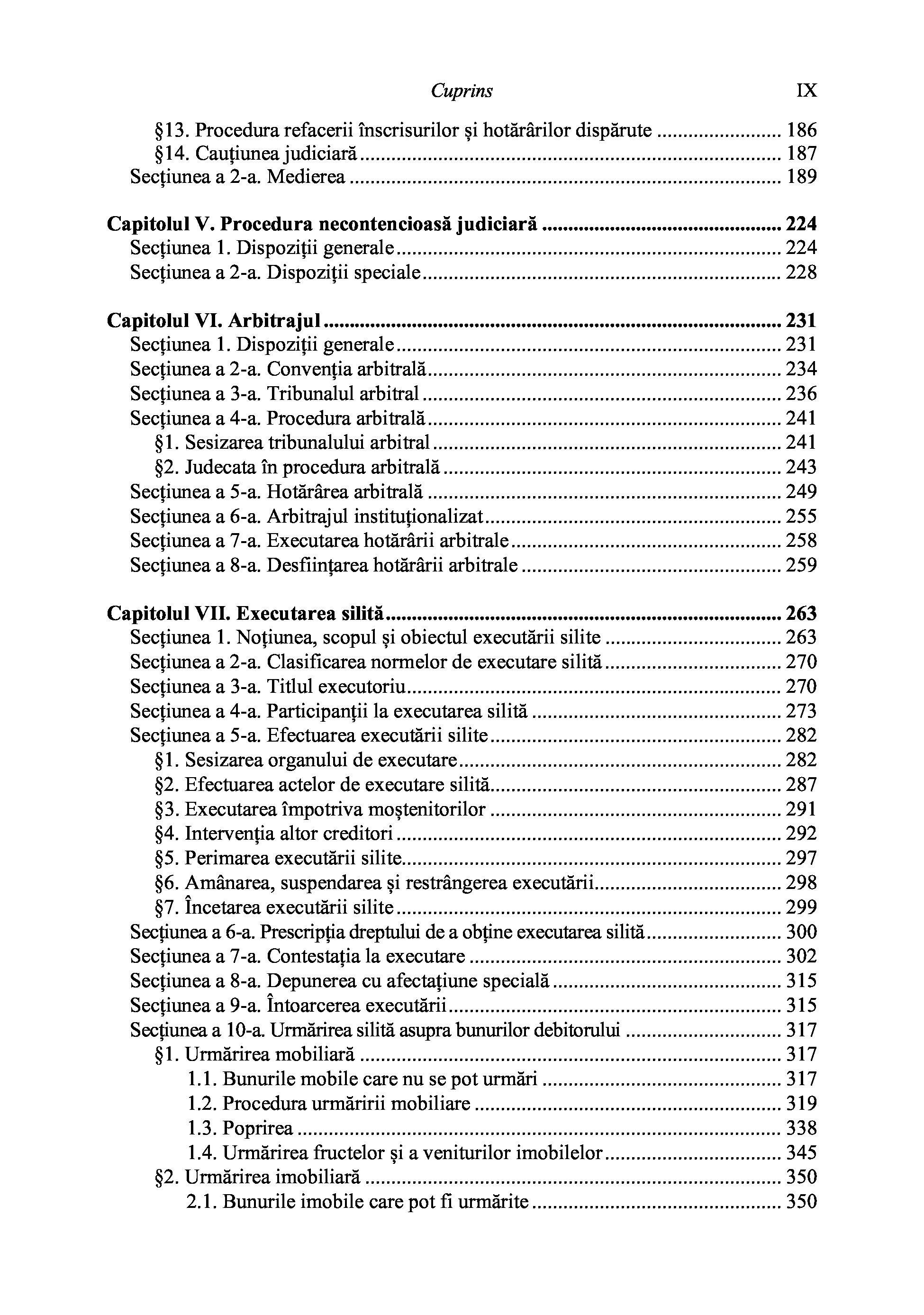 Despre lucrare: Lucrarea cuprinde o analiză de ansamblu a instituțiilor de drept procesual civil, partea specială, conform Codului de procedură civilă. Partea specială urmărește să explice optica legiuitorului privitoare la desfășurarea procesului civil în căile de atac, dispozițiile privind asigurarea unei practici judiciare unitare, contestația privind tergiversarea procesului în procedura necontencioasă, în cadrul procedurilor speciale, a modului în care se desfășoară un litigiu atât în fața instanțelor arbitrale, cât și în executarea silită.