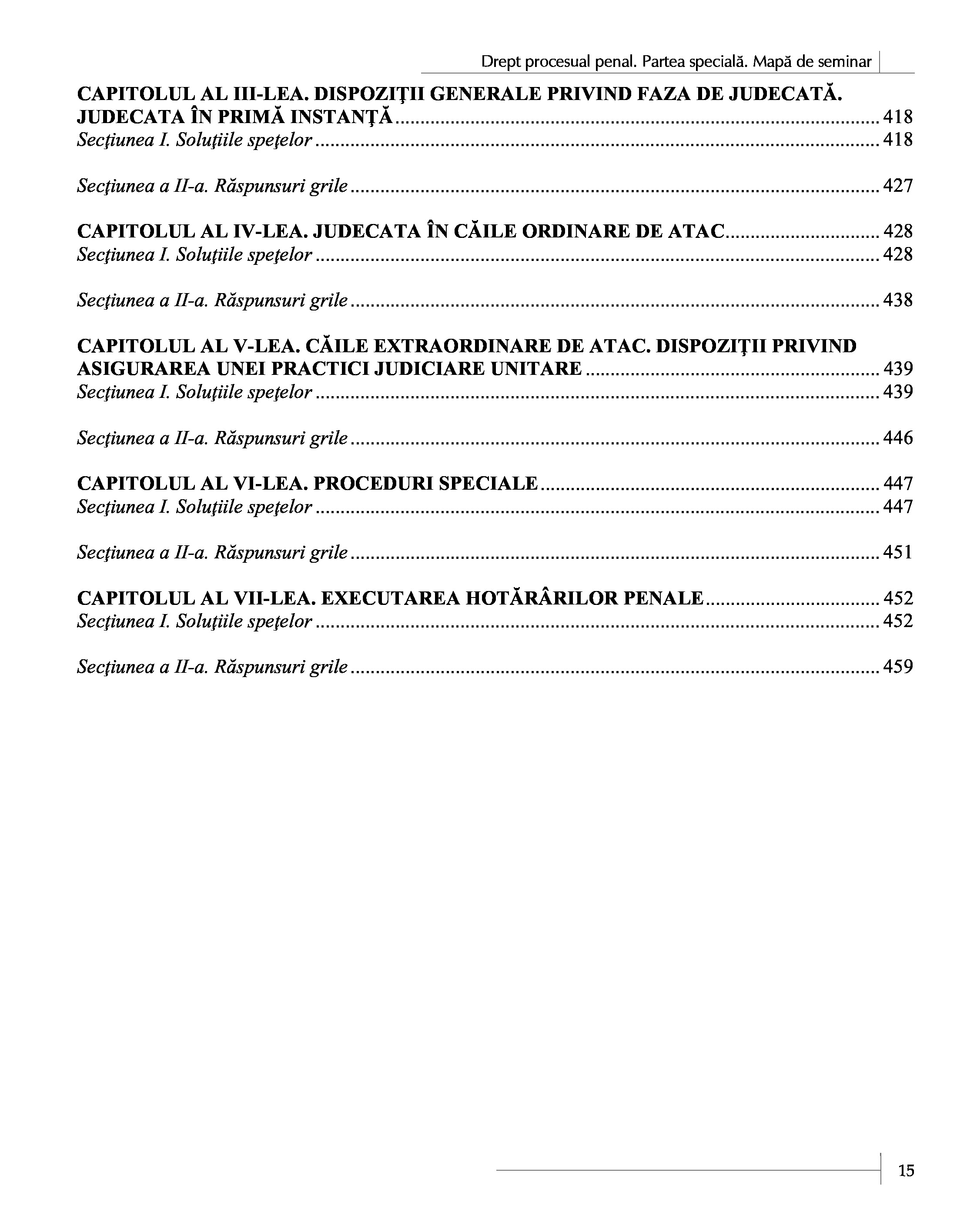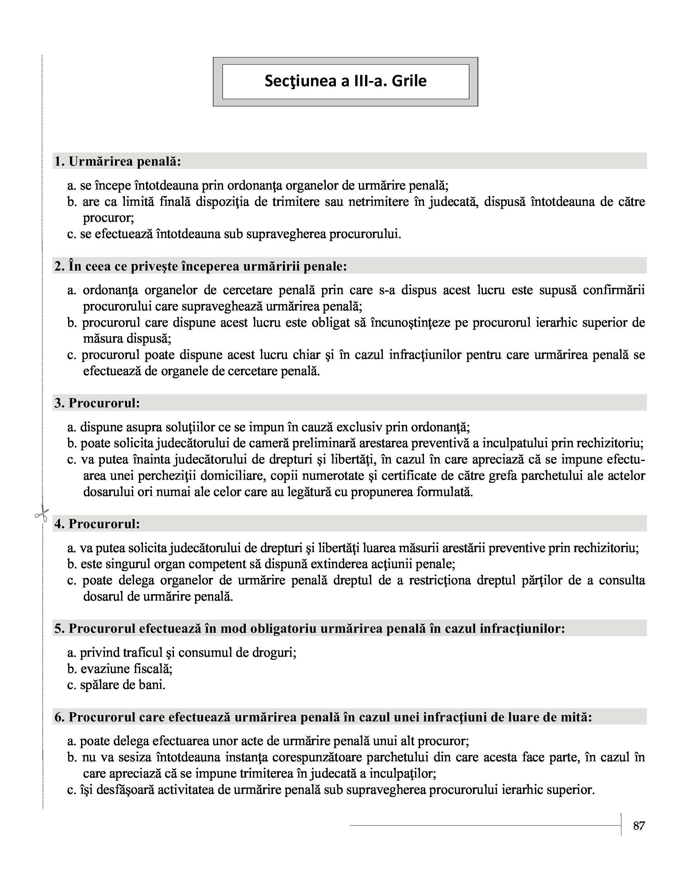 - grilele au trei variante de raspuns, dintre care una sau doua pot fi corecte, asa incat reprezinta un instrument util atat pentru pregatirea examenului la disciplina Procedura penala. Partea speciala, cat si in perspectiva sustinerii examenelor de admitere in profesiile juridice, avand in vedere structura acestor examene;