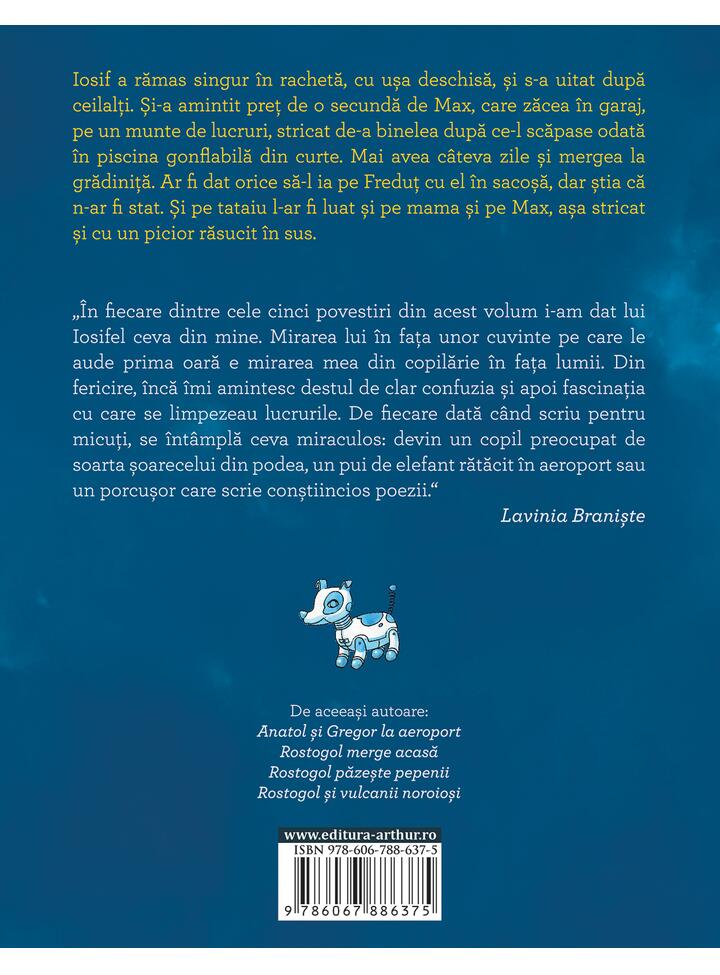 Iosif a rămas singur în rachetă, cu ușa deschisă, și s‑a uitat după ceilalți. Și‑a amintit preț de o secundă de Max, care zăcea în garaj, pe un munte de lucruri, stricat de‑a binelea după ce‑l scăpase odată în piscina gonflabilă din curte. Mai avea câteva zile și mergea la grădiniță. Ar fi dat orice să‑l ia pe Freduț cu el în sacoșă, dar știa că n‑ar fi stat. Și pe tataiu l‑ar fi luat și pe mama și pe Max, așa stricat și cu un picior răsucit în sus.
