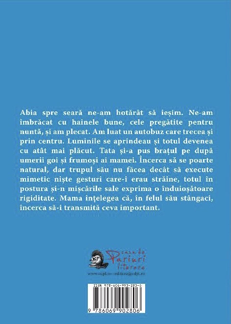 Abia spre seară ne-am hotărât să ieșim. Ne-am îmbrăcat cu hainele bune, cele pregătite pentru nuntă, și am plecat. Am luat un autobuz care trecea și prin centru. Luminile se aprindeau și totul devenea cu atât mai plăcut. Tata și-a pus brațul pe după umerii goi și frumoși ai mamei. Încerca să se poarte natural, dar trupul său nu făcea decât să execute mimetic niște gesturi care-i erau străine, totul în postura și-n mișcările sale exprima o înduioșătoare rigiditate. Mama înțelegea că, în felul său stângaci, încerca să-i transmită ceva important. (Turiștii)