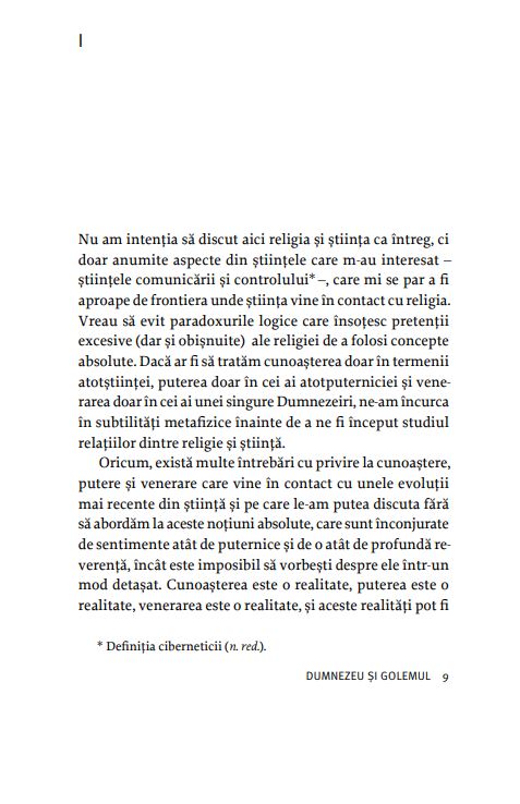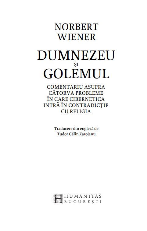 Dumnezeu şi Golemul este o carte cu valențe profetice, care ne proiectează într-un viitor distopic, unde inteligența artificială va schimba dramatic evoluția umanității. Dacă Dumnezeu a creat omul după chipul și asemănarea sa, atunci robotul nu este și el o creație după chipul și asemănarea omului? Să fie omul ucenicul vrăjitor care și-a devansat deja Creatorul, dar care, la rândul său, este predestinat să fie depășit de propria creație, un golem modern? Întrebările formulate de Wiener sunt, astăzi, mai actuale ca oricând.