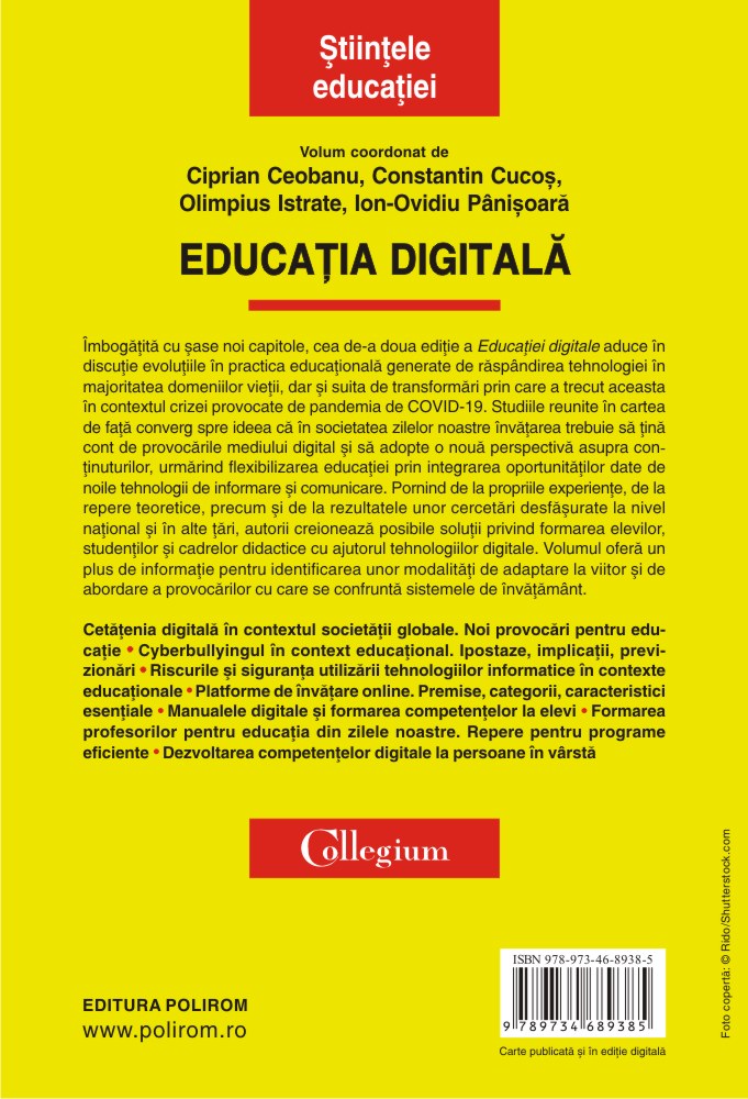 Îmbogățită cu șase noi capitole, cea de-a doua ediție a Educației digitale aduce în discuție evoluțiile în practica educațională generate de răspândirea tehnologiei în majoritatea domeniilor vieții, dar și suita de transformări prin care a trecut aceasta în contextul crizei provocate de pandemia de COVID-19. Studiile reunite în cartea de față converg spre ideea că în societatea zilelor noastre învățarea trebuie să țină cont de provocările mediului digital și să adopte o nouă perspectivă asupra conținuturilor, urmărind flexibilizarea educației prin integrarea oportunităților date de noile tehnologii de informare și comunicare. Pornind de la propriile experiențe, de la repere teoretice, precum și de la rezultatele unor cercetări desfășurate la nivel național și în alte țări, autorii creionează posibile soluții privind formarea elevilor, studenților și cadrelor didactice cu ajutorul tehnologiilor digitale. Volumul oferă un plus de informație pentru identificarea unor modalități de adaptare la viitor și de abordare a provocărilor cu care se confruntă sistemele de învățământ.