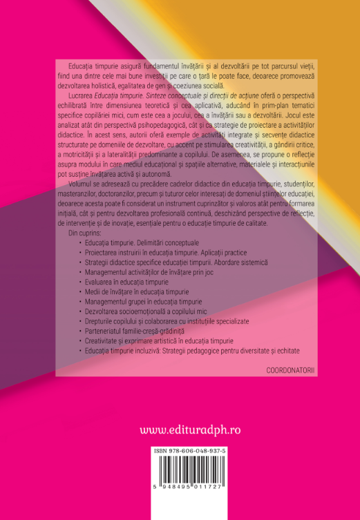 Conceput ca un instrument valoros pentru cadrele didactice, studenți, masteranzi și doctoranzi interesați de domeniul educației timpurii, volumul se remarcă prin coerență, aplicabilitate și actualitate, devenind o resursă indispensabilă pentru formarea inițială și dezvoltarea profesională continuă.
