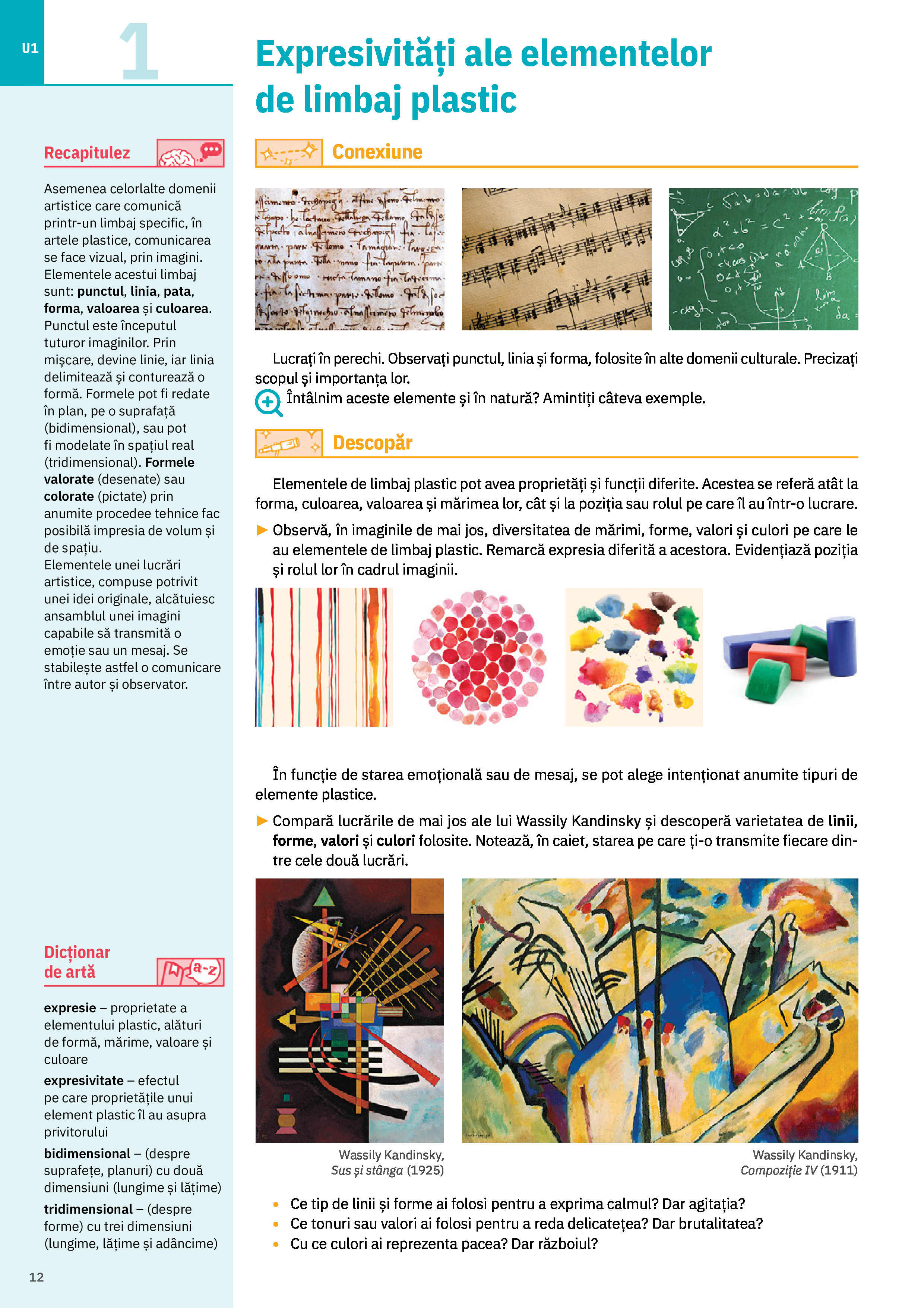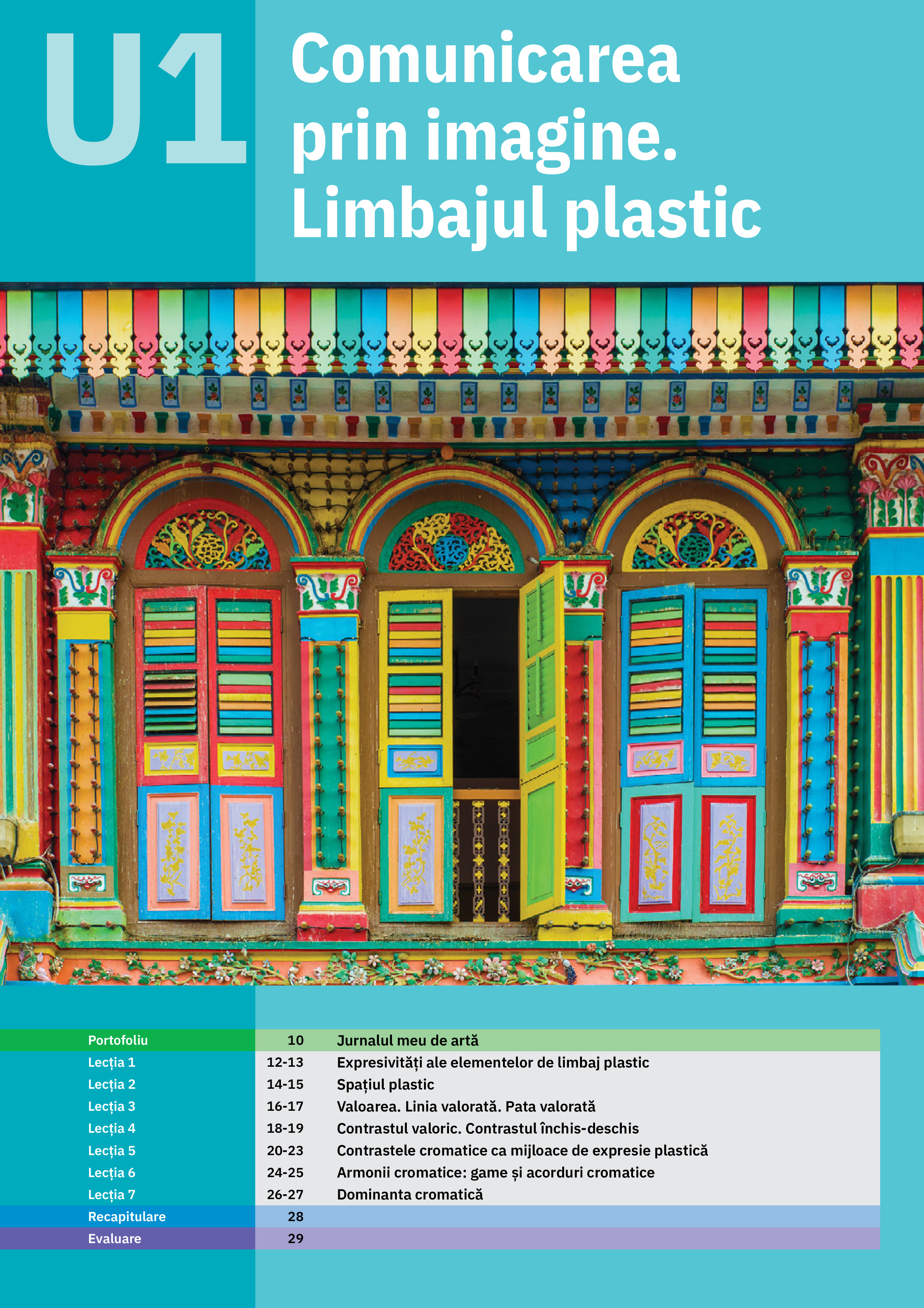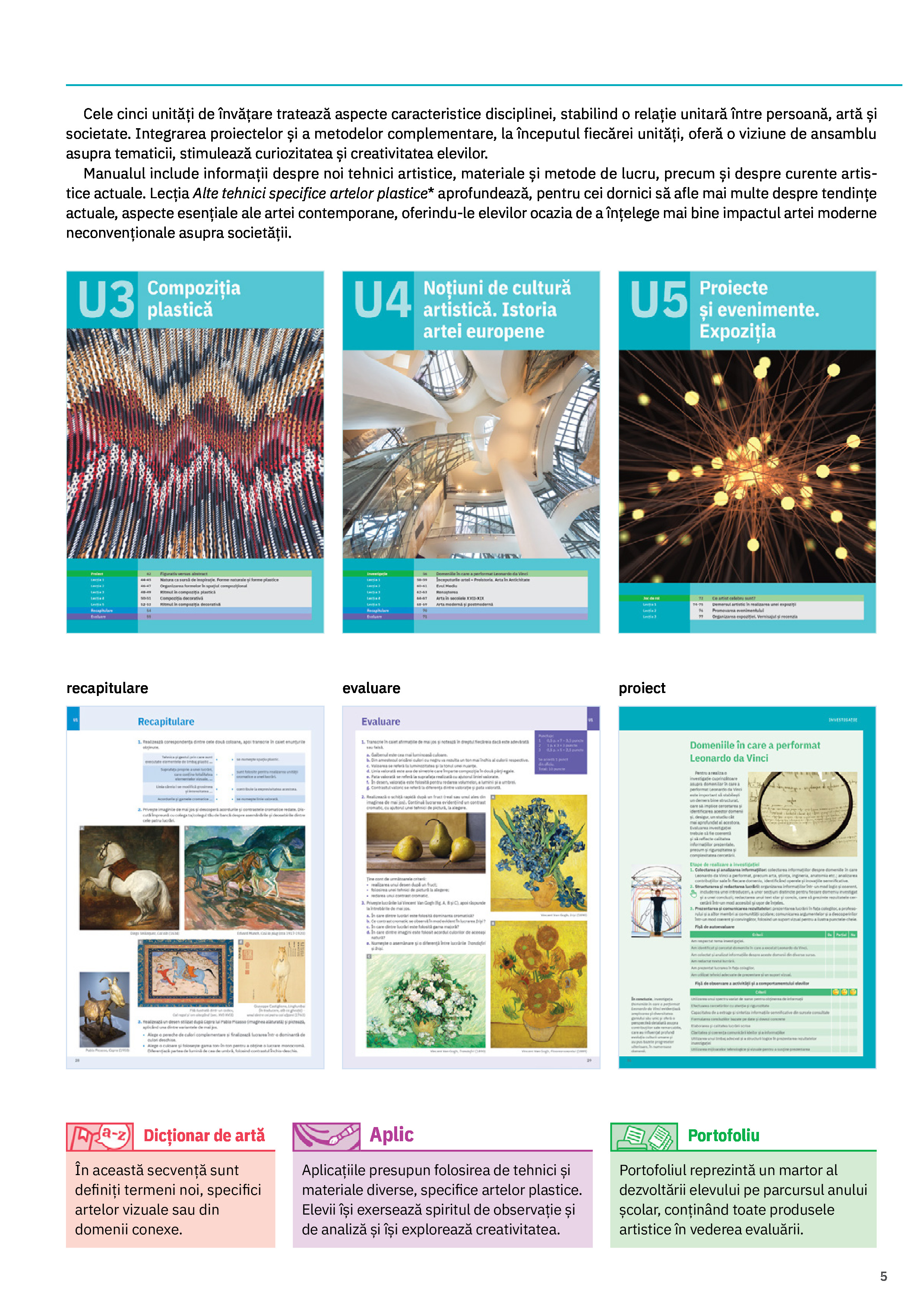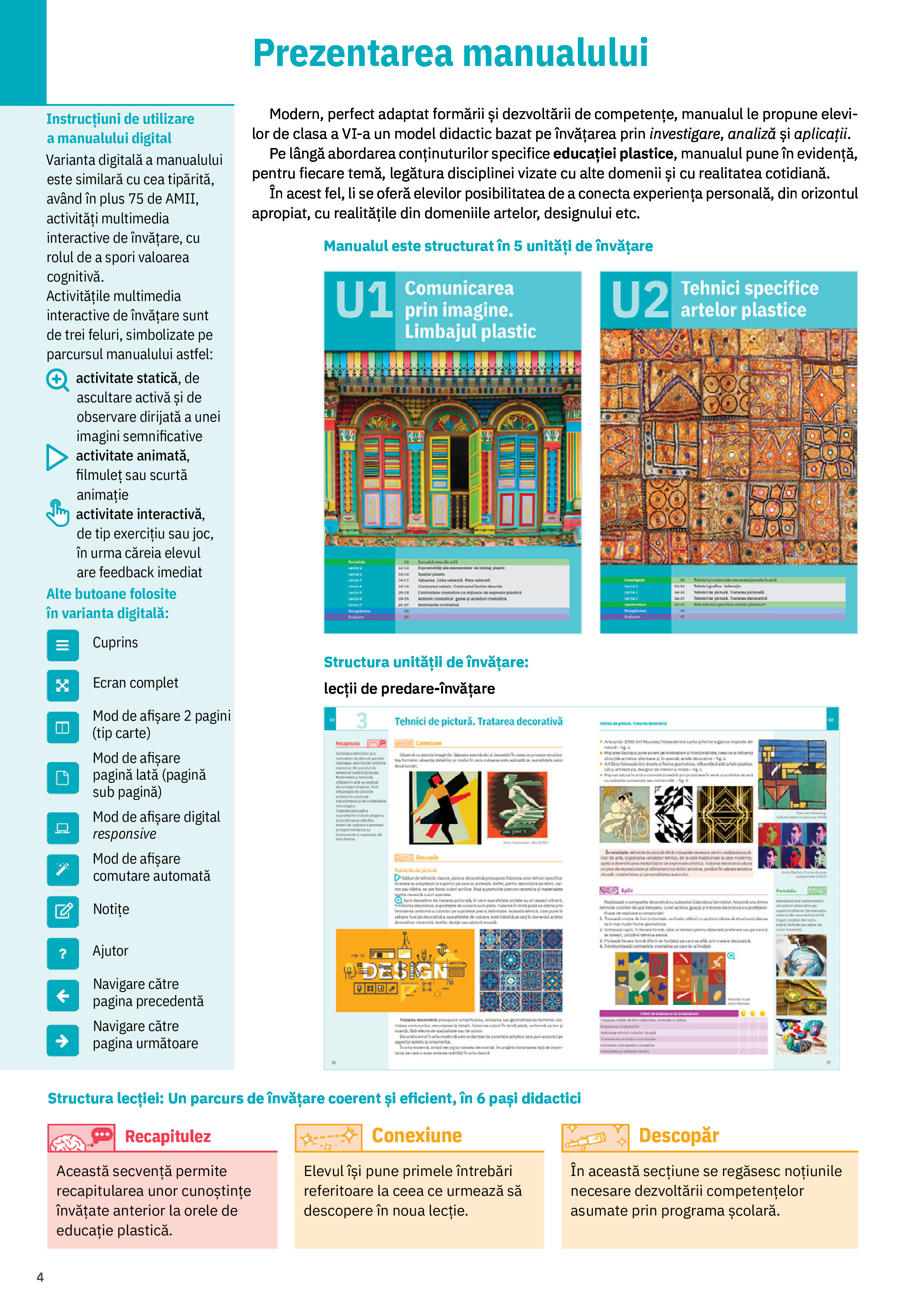 · Modern, perfect adaptat formării și dezvoltării de noi competențe, manualul propune un model didactic bazat pe învățarea prin investigare, analiză și aplicații. Pe lângă abordarea conținuturilor specifice disciplinei, lucrarea prezintă, pentru fiecare temă în parte, legătura acesteia cu alte domenii și cu realitatea cotidiană. Elevul are astfel șansa de a conecta experiența personală, din orizontul apropiat, cu realitățile din domeniile artelor, designului etc.