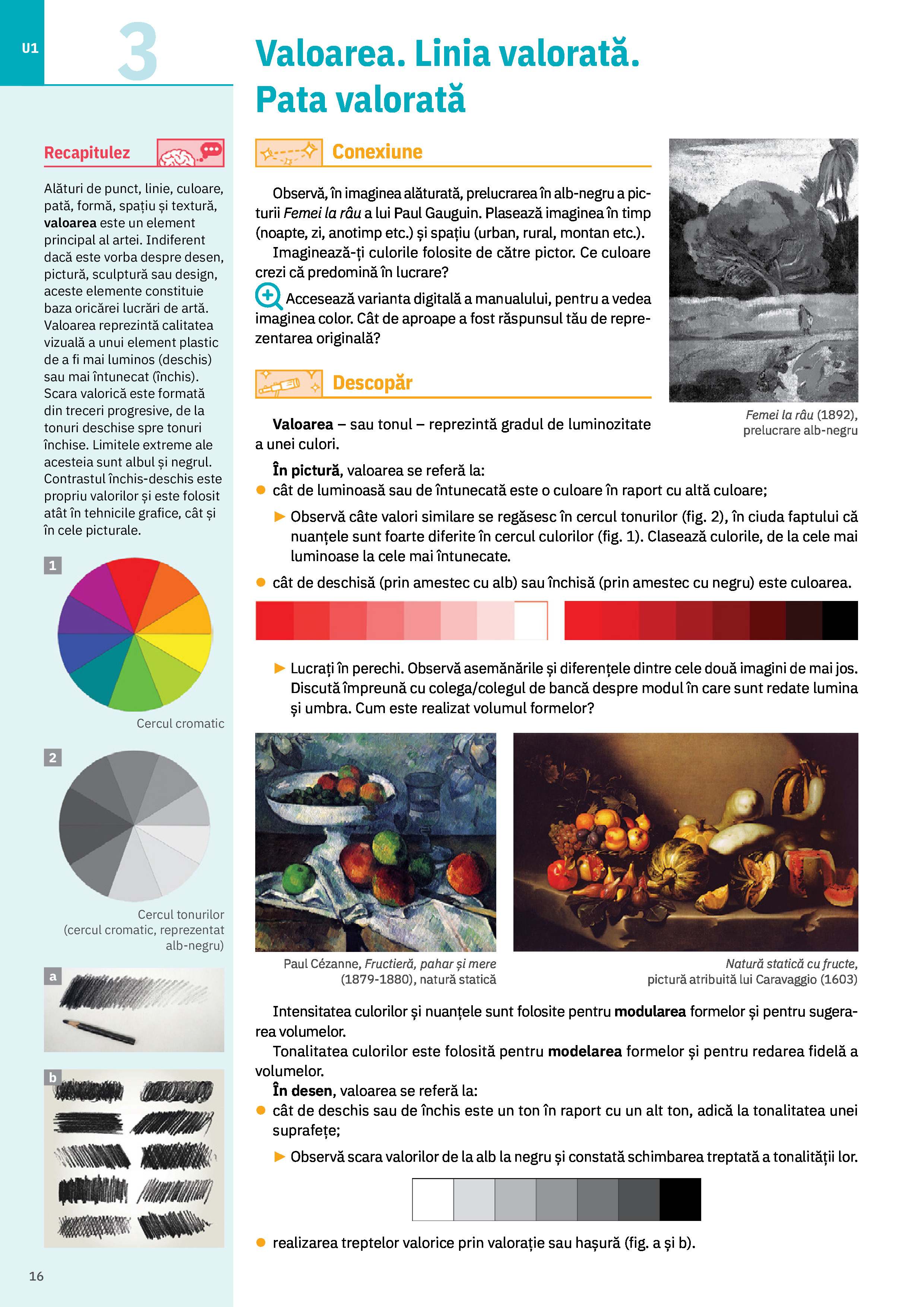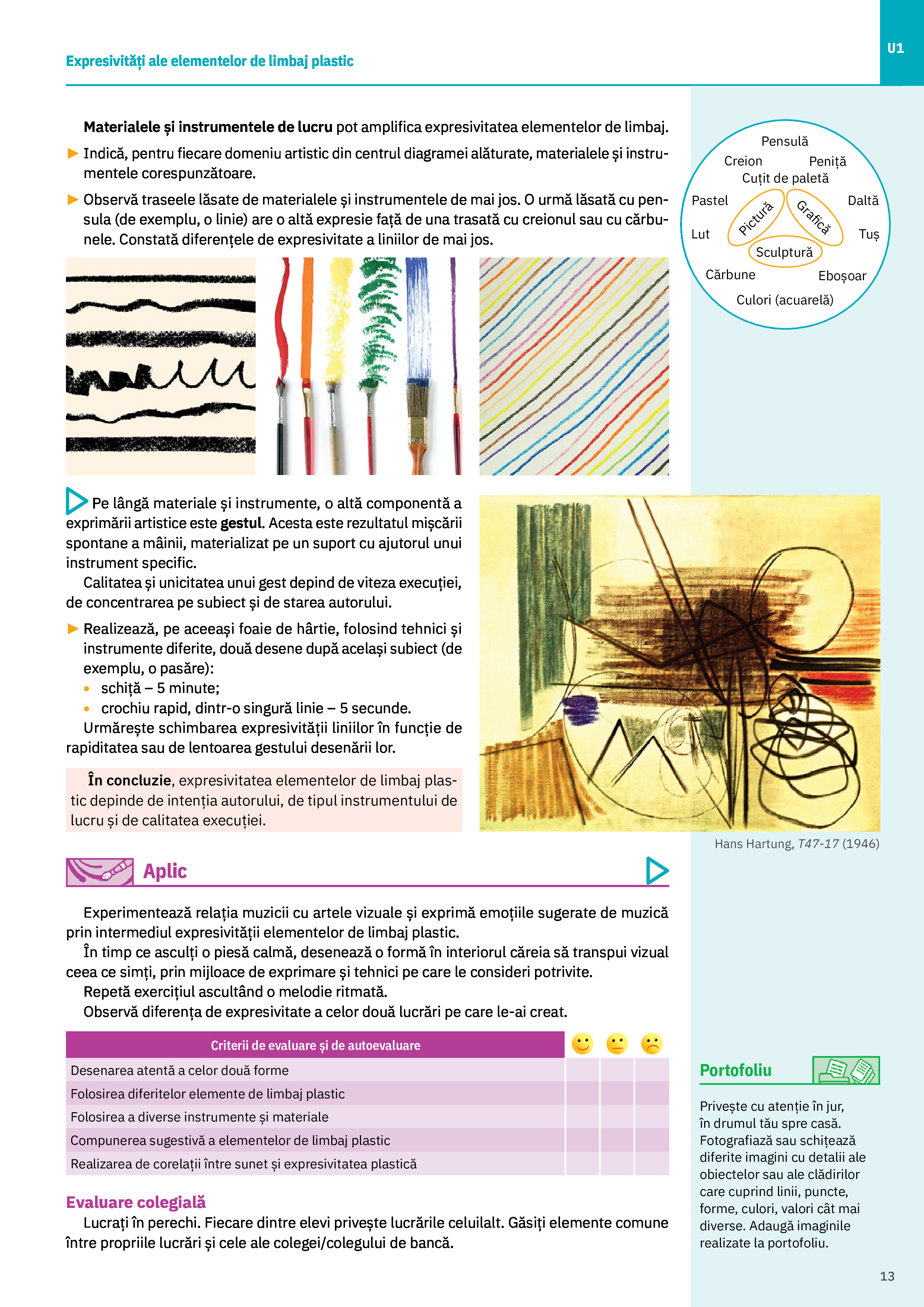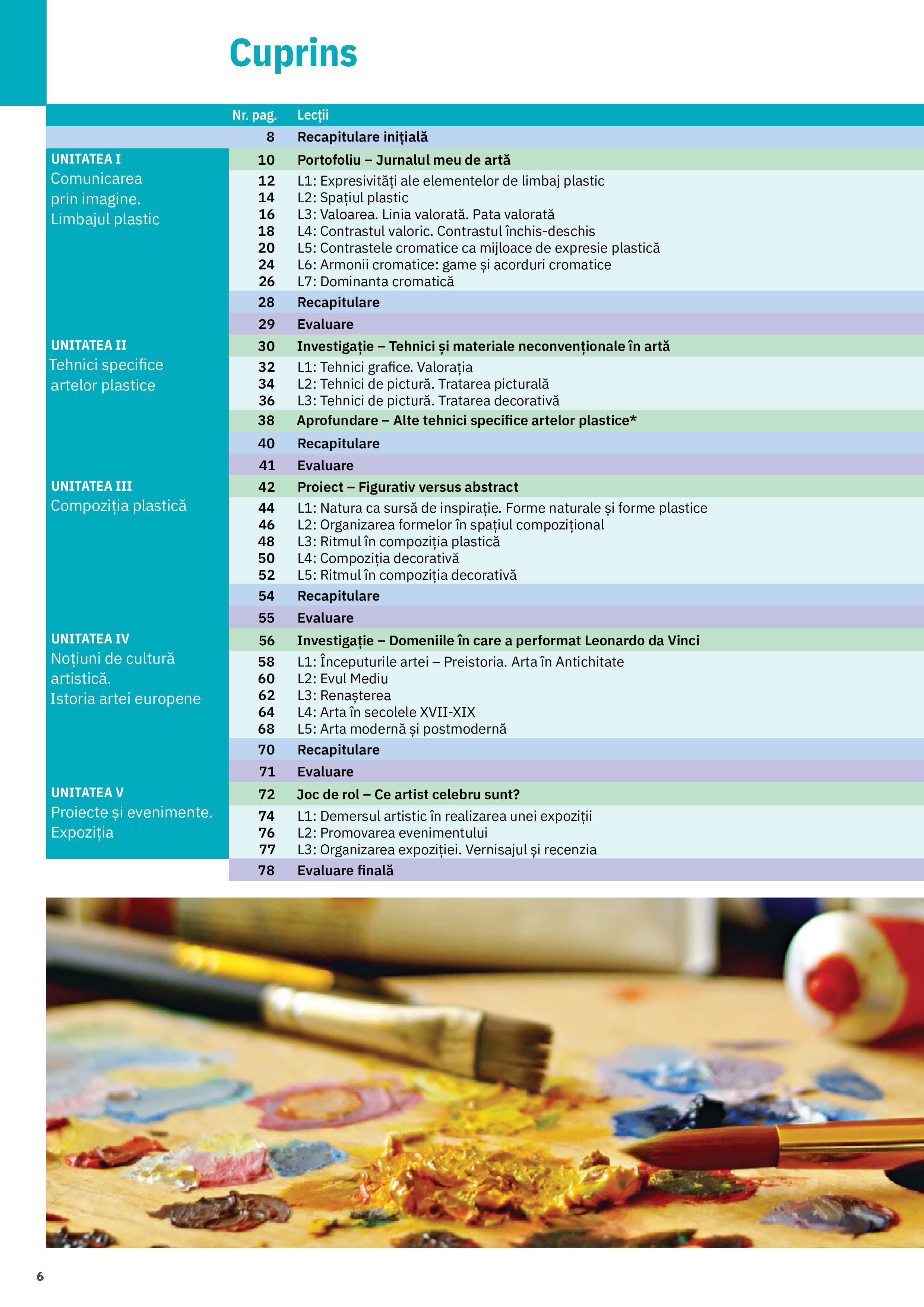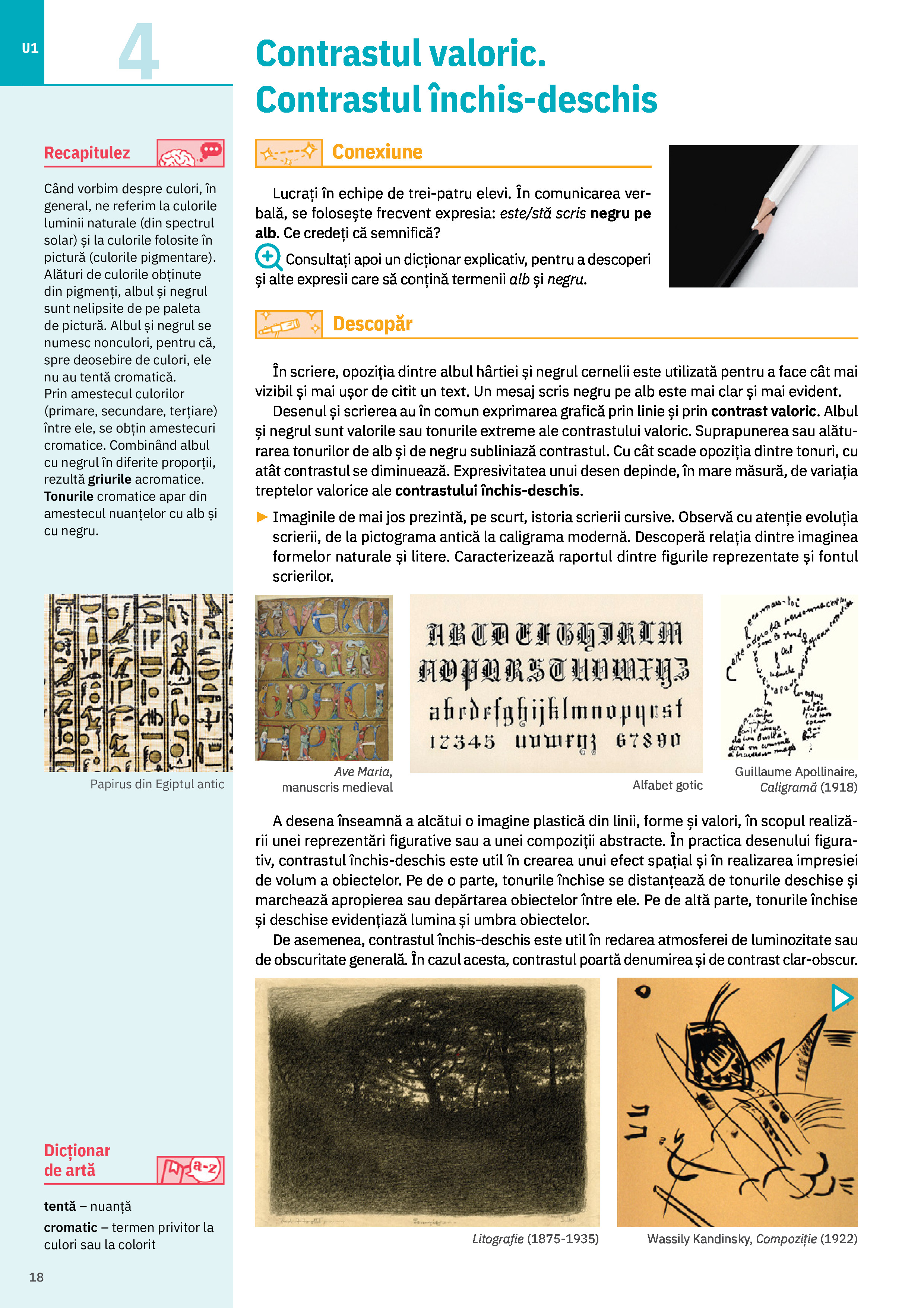 · Modern, perfect adaptat formării și dezvoltării de noi competențe, manualul propune un model didactic bazat pe învățarea prin investigare, analiză și aplicații. Pe lângă abordarea conținuturilor specifice disciplinei, lucrarea prezintă, pentru fiecare temă în parte, legătura acesteia cu alte domenii și cu realitatea cotidiană. Elevul are astfel șansa de a conecta experiența personală, din orizontul apropiat, cu realitățile din domeniile artelor, designului etc.