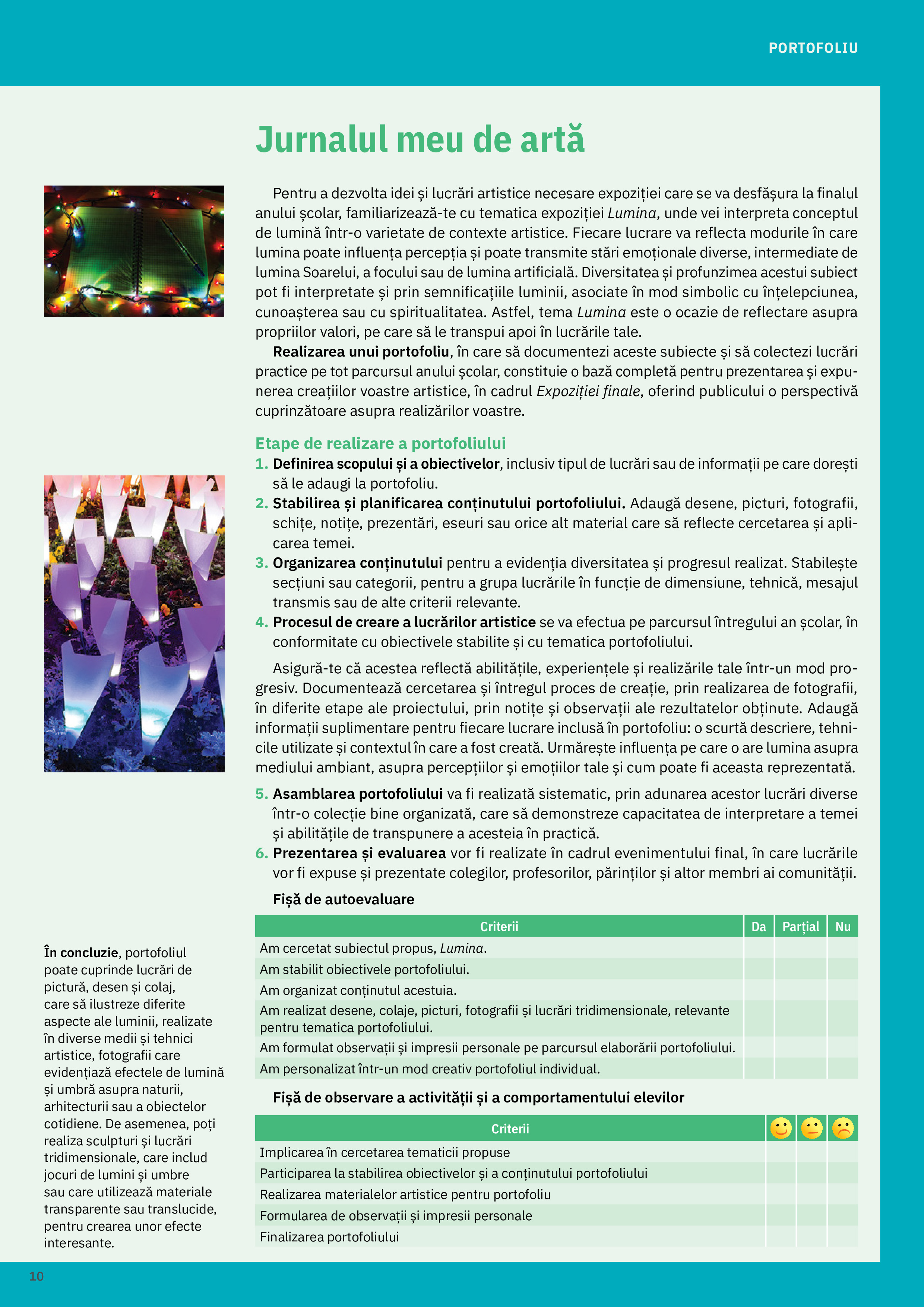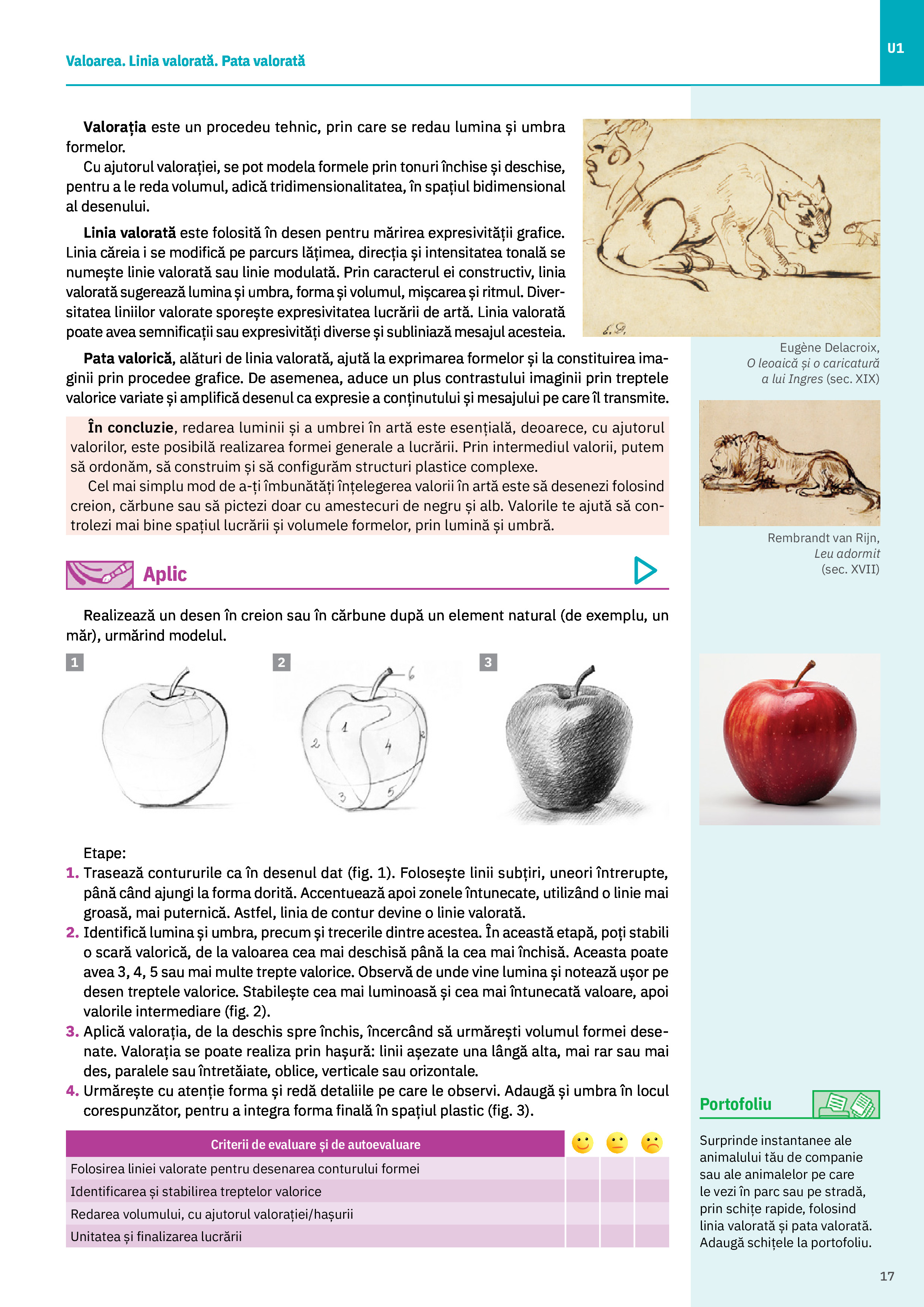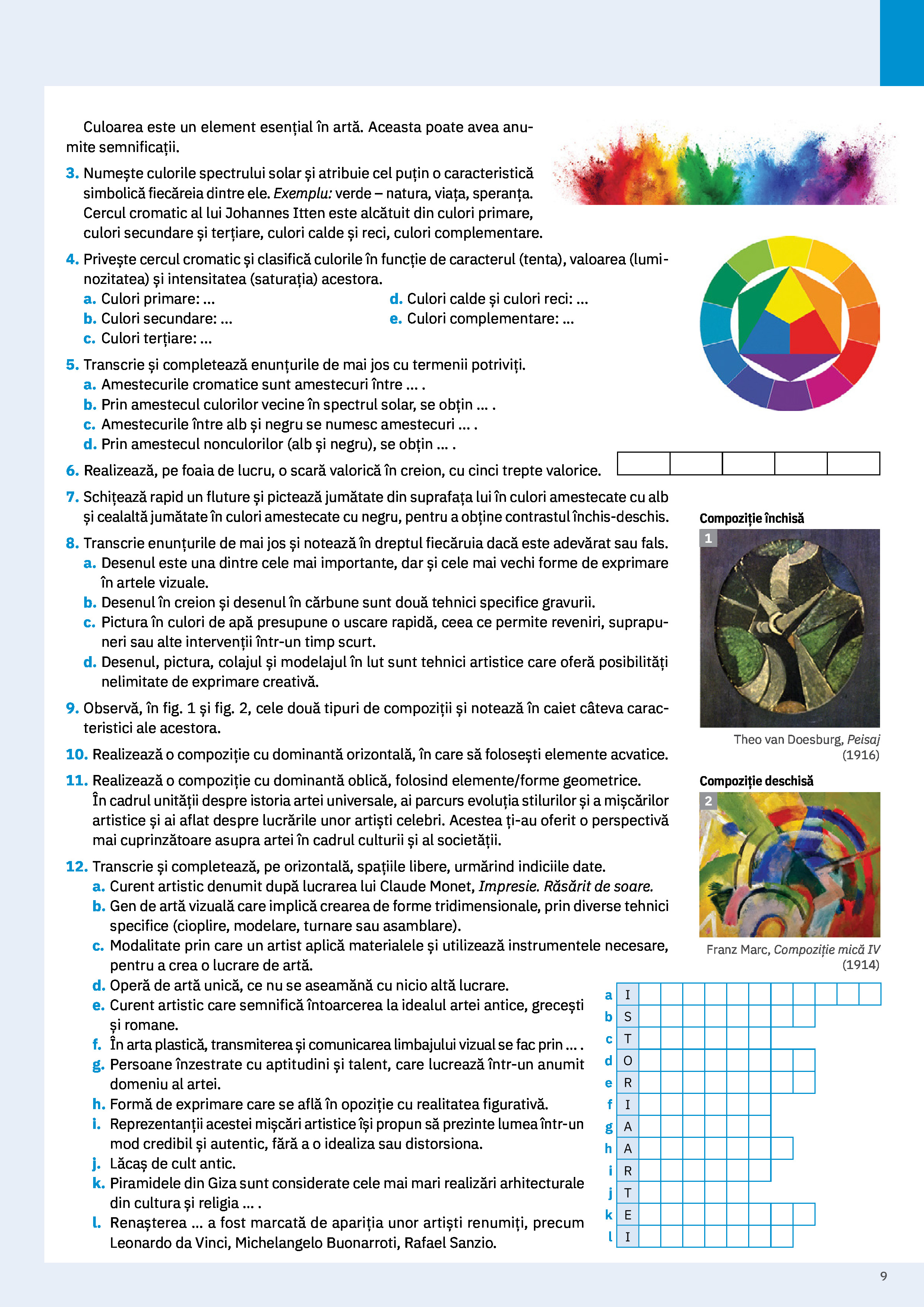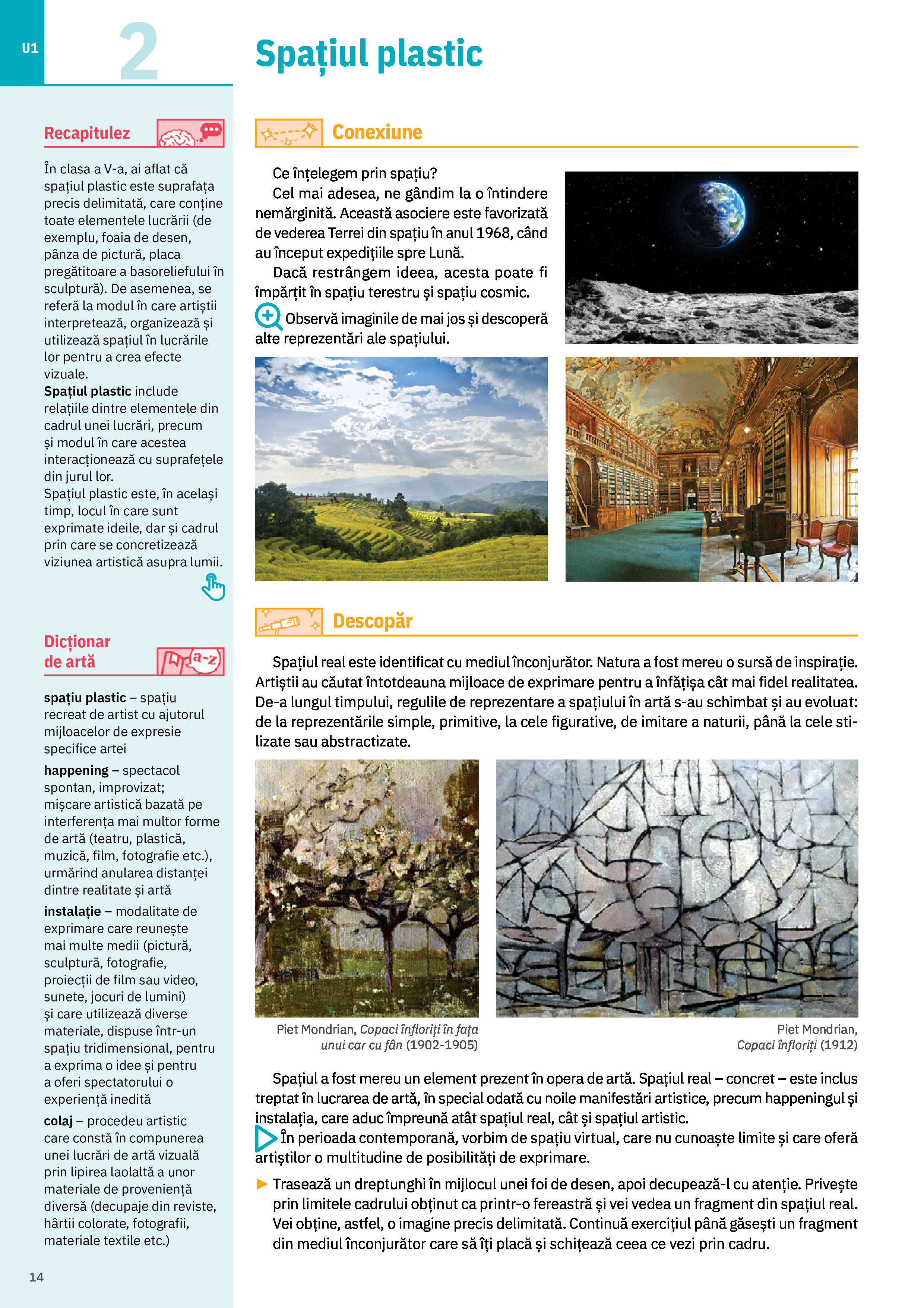 · Modern, perfect adaptat formării și dezvoltării de noi competențe, manualul propune un model didactic bazat pe învățarea prin investigare, analiză și aplicații. Pe lângă abordarea conținuturilor specifice disciplinei, lucrarea prezintă, pentru fiecare temă în parte, legătura acesteia cu alte domenii și cu realitatea cotidiană. Elevul are astfel șansa de a conecta experiența personală, din orizontul apropiat, cu realitățile din domeniile artelor, designului etc.
