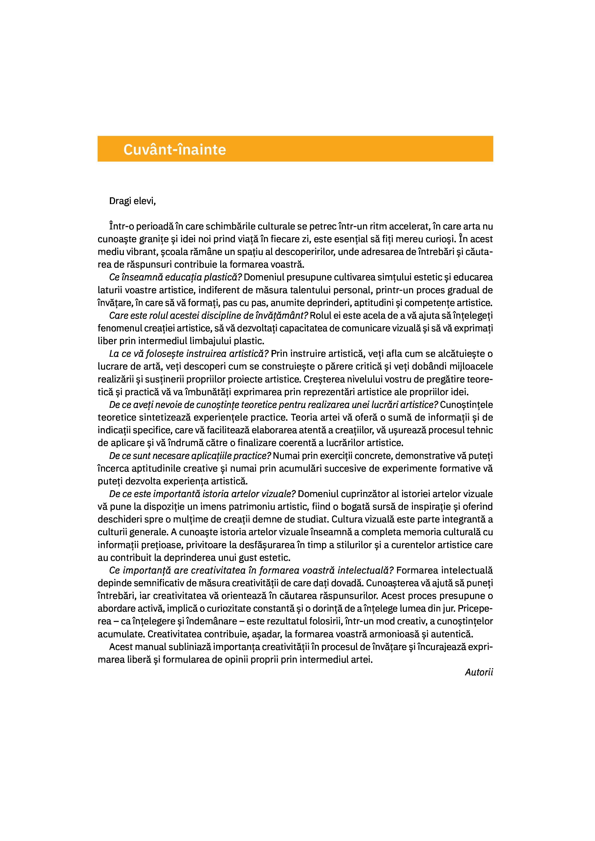 · Manualul este o călătorie coerentă, continuă și progresivă în domeniul educației plastice, dezvoltând gândirea analitică, reflexivitatea, gustul și cultura estetică.